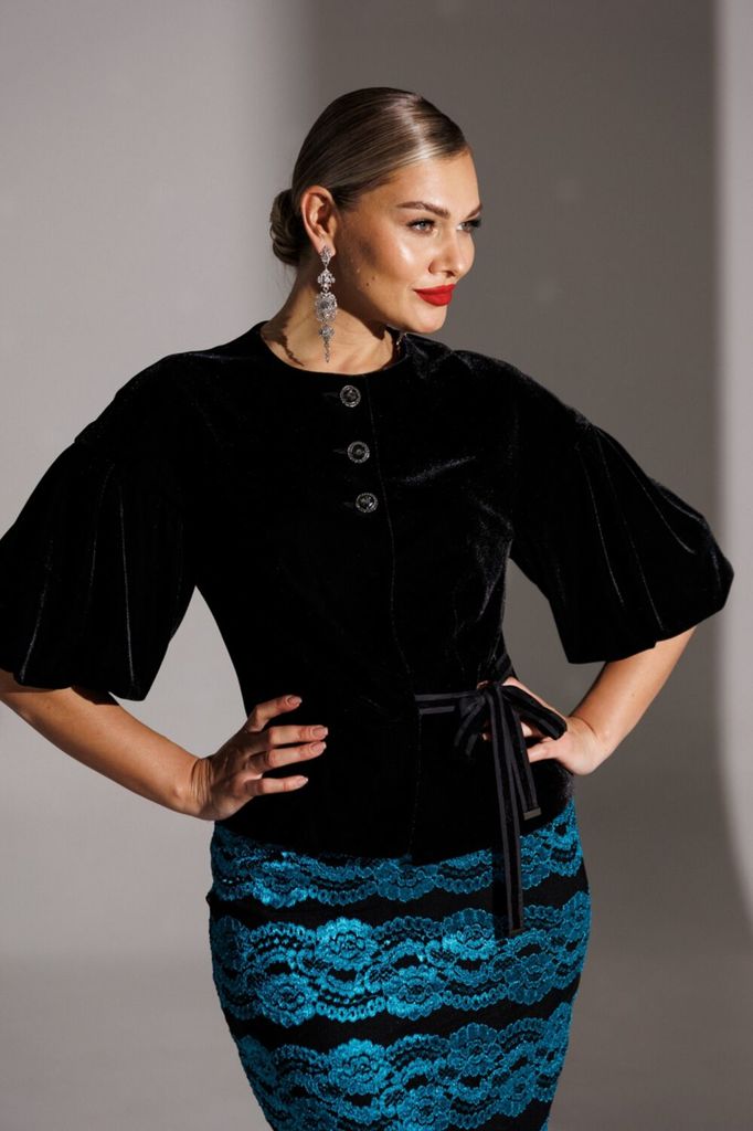 Состав: Жакет: ПЭ-95%; Спандекс-5%; Юбка: ПЭ-95%; Эластан-5%; Нарядный комплект, состоящий из жакета и юбки. Комфортный жакет из велюра полуприлегающего силуэта с центральной комбинированной застежкой... Показать описание на 3 пуговицы и 3 потайные кнопки. Спинка со средним швом и талиевыми вытачками. По переду также талиевые вытачки. Горловина округлой формы. Объемные фантазийные рукава со складками смягчают строгий силуэт. Декором выступают декоративные пуговицы и завязка на талии. Шикарная юбка из сетки с серебряным напылением заужена к низу. Молния и шлица в среднем шве. По талии кокетки. Костюм на подкладке. Замеры 46-52: Жакет Длина спинки 54 54 54 54 Ширина на уровне глубины проймы 48 50 52 54 Ширина по линии талии 43 45 47 49 Ширина по линии бедер 50 52 54 56 Длина рукава от горловины 55 55 55 55 Ширина рукава вверхупо шву втачивания 23 24 25 26 Ширина плеча от горловины до шва рукава 25 25 25 25 Юбка Длина по боковому шву 65 65 65 65 Ширина по линии талии 39 41 43 45 Ширина по линии бедер 51 53 55 57