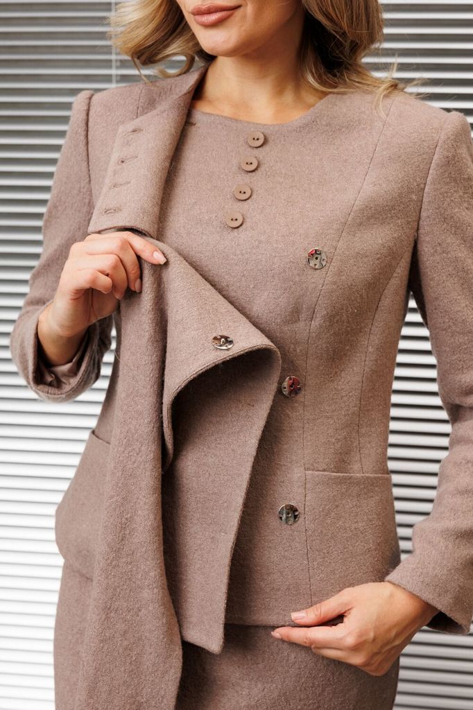 Состав: Вискоза-30%; ПЭ-65%; Спандекс-5%; Комплект женский, двухпредметный, состоит из жакета и юбки. Жакет полуприлегающего силуэта с отрезной баской по линии бочка переда и спинке. На полочках обраб... Показать описаниеотаны прорезные карманы в рамку с клапаном. Спинка со средним швом и рельефами. Полочка с талиевыми вытачками и рельефами. Воротник пиджачного типа. Рукав втачной двухшовый. Юбка прямая зауженная к низу. Сверху на притачном поясе по бокам с резинками. Застежка на тесьму молнию в среднем шве, который переходит в шлицу. Декором является металлическая пуговицы с цепочкой. Костюм на подкладке. Замеры 46-52: Жакет Длина спинки 63,3 64 64 64 Ширина спинки 19,5 20 20,5 21 Ширина на уровне глубины проймы 50 52 54 56 Ширина по линии талии 44 46 48 50 Ширина по линии бедер 56 58 60 62 Длина рукава 61 61 61 61 Ширина рукава вверху 17,5 18 18,5 19 Ширина плеча 12,1 12,3 12,5 12,7 Юбка Длина по боковому шву 69 69 69 69 Ширина по линии талии 40 42 44 46 Ширина по линии бедер 51 53 55 57
