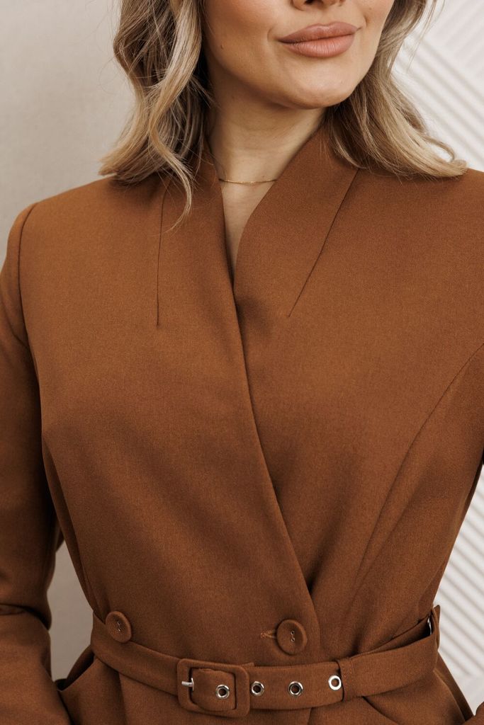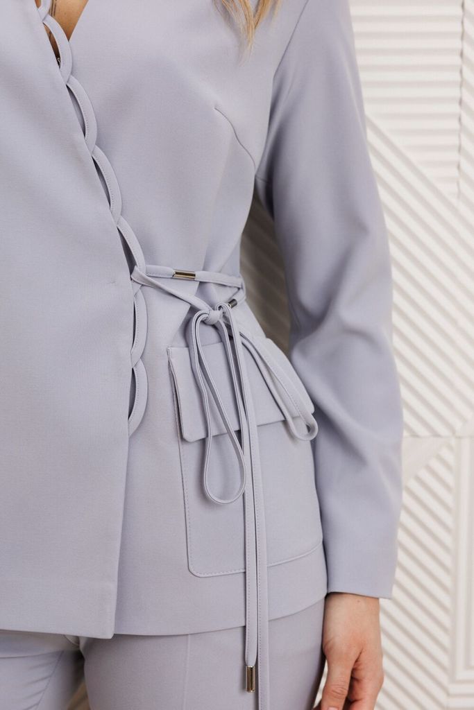 Состав: Вискоза-23%; ПЭ-75%; Спандекс-2%; Брючный костюм, состоящий из жакета и брюк, представляет собой стильный и современный ансамбль, идеально подходящий для различных случаев. Жакет свободного кр... Показать описаниеоя оснащен двубортной застежкой на потайную кнопку, что придает ему элегантный вид. Спинка выполнена со средним швом, а передняя часть украшена нагрудными вытачками и крупными накладными карманами с клапанами, добавляющими практичности. V-образный вырез горловины создает визуальный акцент, а край борта, декорированный воздушными петлями, придает жакету легкость и изящество. Линия плеча спущена, что добавляет расслабленности, а рукав рубашечного покроя обеспечивает комфорт. Особым элементом дизайна является шнур вокруг талии с металлической фурнитурой, который можно регулировать для создания идеальной посадки. Жакет также дополнен съемной брошью, что позволяет варьировать стиль. Внутренняя подкладка обеспечивает дополнительный комфорт. Брюки прямого кроя с заутюженными стрелками подчеркивают строгость образа. Боковые карманы добавляют функциональности, а застежка в среднем шве и притачной пояс с резинкой сзади гарантируют удобную посадку. Этот костюм станет отличным выбором для офисной обстановки или деловых встреч, сочетая в себе элегантность и современный подход к классическому стилю. длина жакета по спинке: 68см длина рукава: 58 см длина брюк: 108 см