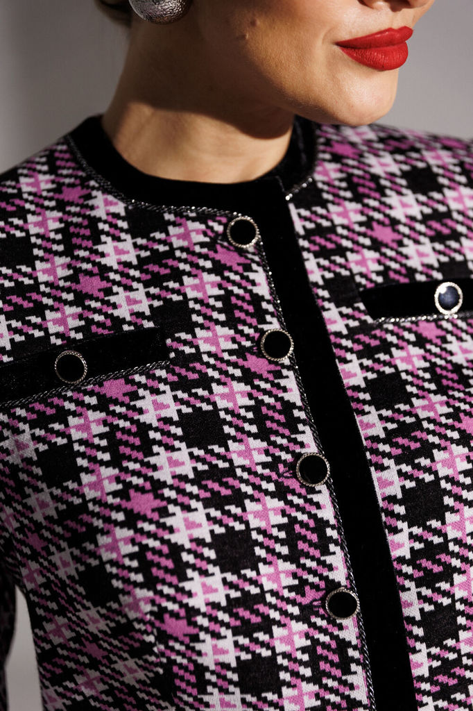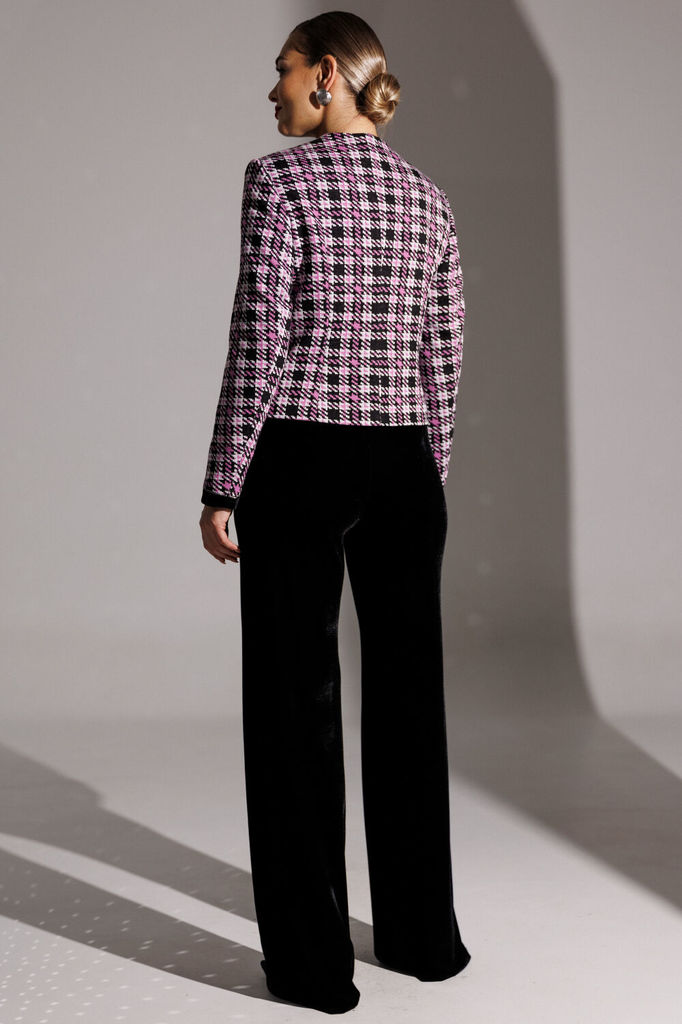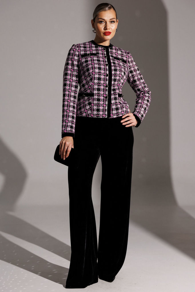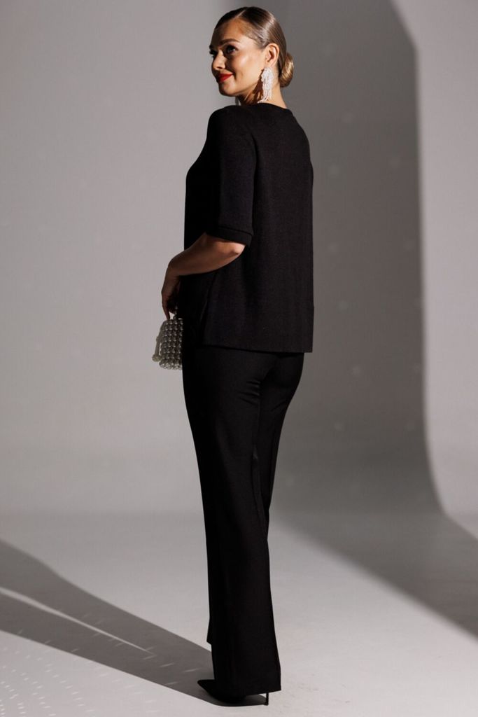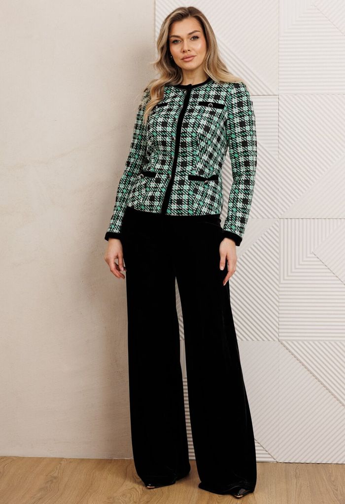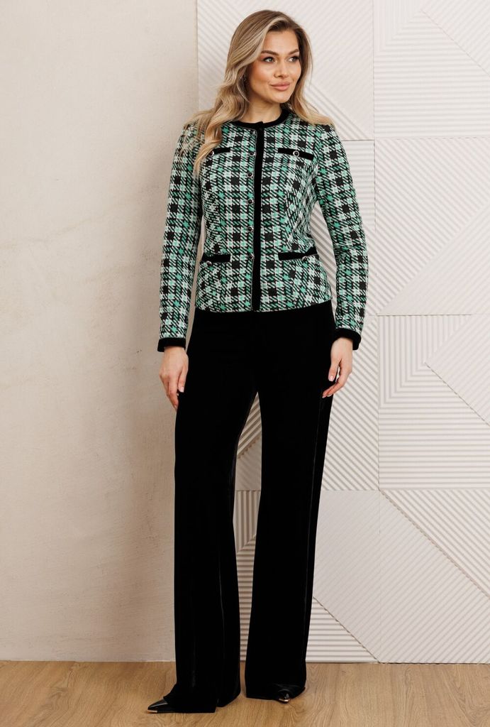 Состав: Жакет: Вискоза-33%; ПЭ-65%; Спандекс-2%; Брюки: ПЭ-95%; Спандекс-5%; Брючный костюм в стиле Шанель представляет собой элегантное сочетание классики и современности. Жакет выполнен из трикотажн... Показать описаниеого полотна с актуальным принтом «гусиная лапка», имеет полуприлегающий силуэт и центральную застежку на пуговицы. Спинка оформлена средним швом и талиевыми вытачками, что обеспечивает идеальную посадку. Передняя часть также украшена талиевыми вытачками, а округлая горловина подчеркивает женственность образа. Функциональные карманы с листочками расположены внизу, в то время как имитация карманов в верхней части переда добавляет изюминку. Листочки на карманах и планка горловины выполнены из бархата с отделкой по краям, создавая контраст текстур. Рукава втачные, двухшовные, с планкой по низу, также отделанной бархатом. Жакет на подкладке, что обеспечивает комфорт при носке. Брюки палаццо из бархата имеют стильные широкие штанины и удобную резинку на поясе, что делает этот костюм идеальным выбором как для деловых встреч, так и для вечерних выходов. Замеры 46-52: Жакет Длина спинки 56 56 56 56 Ширина спинки 38 39 40 41 Ширина на уровне глубины проймы 50 52 54 56 Ширина по линии талии 45 47 49 51 Длина рукава 61 61 61 61 Ширина по линии бедер 50 52 54 56 Ширина рукава вверху 17 18 19 20 Ширина плеча 12,5 13,5 13,5 13,5 Брюки Длина по боковому шву 112 112 112 112 Ширина по линии талии 41 43 45 47 Ширина по линии бедер 48 50 52 54
