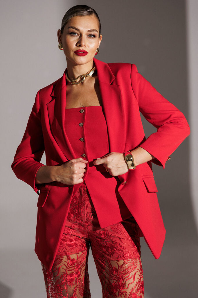 Состав: ПЭ-97%; Спандекс-3%; Капсула RED CODE - Ваша формула смелого праздника. Она создана для особых случаев включает в себя жакет, корсет и брюки, создавая элегантный и стильный образ. Жакет выполн... Показать описаниеен в классическом стиле с полуприлегающим силуэтом. Он удлиненный, имеет центральную застежку на одну пуговицу и элегантные детали, такие как спинка с средним швом и шлицей, а также перед с талиевыми вытачками и наклонными карманами с клапанами. Воротник пиджачного типа добавляет строгости, а втачные двухшовные рукава длиной 3/4 со шлицей в локтевом шве и пуговицей придают жакету изысканный вид. Жакет на подкладке. Мы собрали все элементы новогодней коллекции в единую капсулу, где каждая вещь - не просто предмет гардероба, а часть большой стилистической головоломки. Собирайте образы как конструктор, меняйтесь в течение вечера и будьте неотразимы в каждой роли! Замеры 44-50: Длина спинки 78 78 78 78 Ширина спинки 36,5 37,5 38,5 39,5 Ширина на уровне глубины проймы 49 51 53 55 Ширина по линии талии 47 49 51 53 Длина рукава 50 50 50 50 Ширина по линии бедер 51 53 55 57 Ширина рукава вверху 15,5 16,5 17,5 18,5 Ширина плеча 12 12 12 12