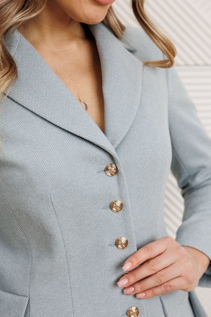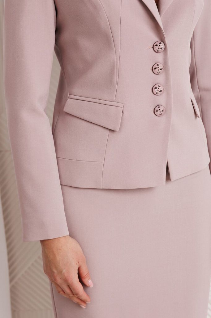 Состав: Вискоза-23%; ПЭ-75%; Спандекс-2%; Жакет полуприлегающего силуэта с двубортной застёжкой на одну пару обтяжных, из основной ткани, пуговиц и одной потайной. Край борта фигурной формы,придающей ... Показать описаниединамичность жакету. На полочке выполнены фигурные рельефы, которые дополнены функциональными карманами, гармонично вписывающимися в общую структуру изделия. Спинка со средним швом и вертикальными рельефами из проймы. Воротник с цельнокроенной стойкой, что придает жакету элегантный и строгий вид. Рукава двухшовные, со шлицей в локтевом шве на одну пуговицу, также обтяжную из основной ткани.Жакет дополнен шлёвками и съемным поясом из основной ткани с пятью блочками на обтяжную пряжку, чем придает дополнительный акцент на талии. Жакет на подкладке. Юбка, длиной ниже колена, зауженная к низу. Застёжка в левом боковом шве на потайную молнию и пуговицу. На переднем и заднем полотнище юбки обработаны талевые вытачки, которые обеспечивают точную посадку по фигуре. Юбка на поясе, сзади частично на резинке для удобства и комфортной посадки.В среднем шве юбки обработана шлица, которая обеспечивает свободу движений. Юбка также на подкладке. Костюм выполнен из качественной костюмной ткани, что придает изделию прочность и долговечность, а также создает элегантный и современный образ, подходящий для различных деловых мероприятий и повседневной носки. длина жакета по спинке: 63,5см длина рукава: 62 см длина юбки с поясом: 77,5 см Замеры 46-52: Жакет Длина спинки 63,5 63,5 63,5 63,5 Ширина спинки 38 39 40 41 Ширина на уровне глубины проймы 49 51 53 55 Ширина по линии талии 46 48 50 52 Ширина по линии бедер 53 55 57 59 Длина рукава 62 62 62 62 Ширина рукава вверху 17 18 19 20 Ширина плеча 12,0 12,5 13 13 Юбка Длина по боковому шву (с поясом) 77,5 77,5 77,5 77,5 Ширина по линии талии 42 43 45 47 Ширина по линии бедер 50 52 54 56 В размерах 52-54 застежка смещенная, на три пуговицы.