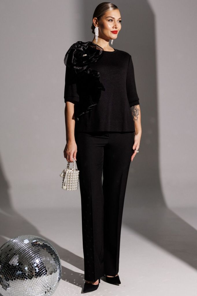 Состав: Блуза: ПЭ-70%; Спандекс-10%; Шерсть-20%; Брюки: ПЭ-96%; Спандекс-4%; Создать нарядный образ с брюками возможно вместе с нашей новинкой ! Комплект состоит из блузы и брюк. Блуза выполнена из то... Показать описаниенкого, струящегося трикотажа, имеющего в составе ангору. Блуза полуприлегающего силуэта, по низу с перепадом длины. Перед декорирован акцентным дизайнерским цветком из органзы. Рукав втачной с манжетой. Брюки классические, прямого силуэта, с заутюженными стрелками, боковыми карманами шлевками для ремня. Замеры 46-54: Блуза Длина спинки 67 67 67 67 67 Ширина спинки 39 41 42 43 44 Ширина на уровне глубины проймы 51 53 55 57 59 Ширина по линии талии 48 50 52 54 56 Длина рукава 33 33 33 33 33 Ширина по линии бедер 53 55 57 59 61 Ширина рукава вверху 16 17 18 19 20 Ширина плеча 9,5 9,5 9,5 9,5 9,5 Брюки Длина по боковому шву 109 109 109 109 109 Ширина по линии талии 40 42 44 46 48 Ширина по линии бедер 51 53 55 57 59