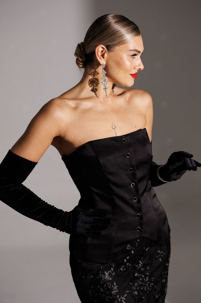 Состав: Корсет: ПЭ-100%; Подкладка: Вискоза-45%; ПЭ-55%; Дерзкий акцент Вашего праздника! Корсет прилегающего силуэта с атласной ткани с регилином по рельефам по переду и спинке,который обеспечивает д... Показать описаниеополнительную жёсткость и посадку на фигуре. Застёжка центральная бортовая на 7 петель и пуговиц. Низ переда фигурной заострённой формы,что подчёркивает элегантный силуэт. Модель идеально подходит для создания строгих, утонченных образов и может использоваться как в качестве элемента вечернего наряда, так и для повседневных образов с более нейтральными деталями. Наденьте его с нашей гипюровой юбкой - это беспроигрышный дуэт, где ажур и строгость подчеркивают друг друга. Для вечеринки дополните его велюровыми брюками и бархатным жакетом. Получится образ, в котором есть все: и дерзость, и уют, и роскошь! Замеры 44-50: Длина спинки 33 33 33 33 Ширина на уровне глубины проймы 44 46 48 50 Ширина по линии талии 36 38 40 42 Ширина по линии бедер 48 50 52 54
