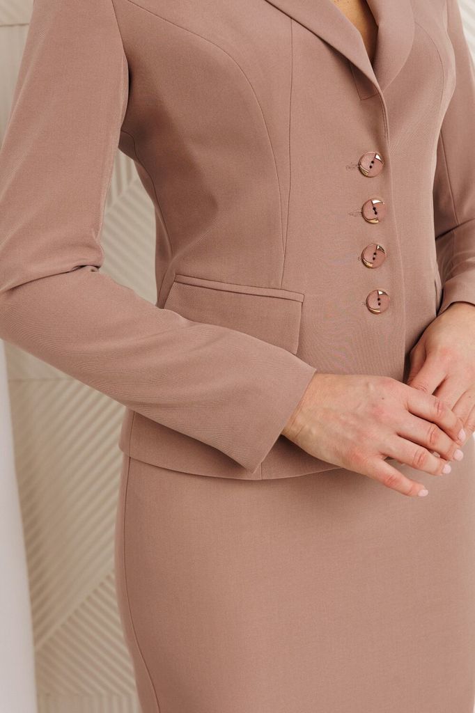 Состав: Вискоза-33%; ПЭ-65%; Спандекс-2%; Костюм включает в себя стильный жакет и элегантную юбку. Жакет выполнен в полуприлегающем силуэте с центральной застежкой на пуговицы, что придает ему аккурат... Показать описаниеный вид. Спинка жакета имеет средний шов, а передняя часть украшена вертикальными рельефами и накладными карманами с пуговицей. Округлая горловина дополнена кантами по краю, что создает изящный акцент. Рукава длиной 3/4 слегка расширяются к низу и оформлены отделкой в виде цветка из отделочного материала, добавляя индивидуальности. Юбка имеет зауженный к низу силуэт и удобно сидит на притачном поясе с резинкой, обеспечивая комфорт. Молния и шлица расположены в среднем шве. Весь костюм подкладке, что придает ему дополнительный комфорт и завершенность. Замеры 46-52: Жакет Длина спинки 54 54 54 54 Ширина спинки 38 39 40 41 Ширина на уровне глубины проймы 51 53 55 57 Ширина по линии талии 47 49 51 53 Длина рукава 47 47 47 47 Ширина по линии бедер 52 54 56 58 Ширина рукава вверху 18 19 20 21 Ширина плеча 12 13 13 13 Юбка Длина по боковому шву 78 78 78 78 Ширина по линии талии 39 41 43 45 Ширина по линии бедер 51 53 55 57