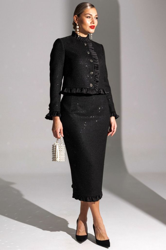 Состав: Хлопок-5%; ПАН-95%; Этот нарядный костюм состоит из жакета и юбки, идеально подходящих для особых случаев. Укороченный жакет полуприлегающего силуэта имеет центральную застежку на пуговицы и д... Показать описаниеетализированную спинку со средним швом и талиевыми вытачками, что подчеркивает фигуру. Перед жакета украшен нагрудными вытачками, а округлый вырез горловины придает ему элегантный вид. Рукава втачные двухшовные, дополненные шлицей в локтевом шве и пуговицами, которые добавляют изящества. Декоративная рюша из атласа обрамляет вырез горловины, край борта, низ жакета и низ рукава, создавая романтичный акцент. Юбка с завышенной линией талии, зауженная к низу, идеально сочетается с жакетом. Она оснащена разрезом и молнией в среднем шве, а верх юбки выполнен на обтачке, что обеспечивает комфорт и стиль. Низ юбки также декорирован атласной рюшей, придающей завершенность образу. Костюм полностью на подкладке, что обеспечивает дополнительный комфорт и изысканный вид. Замеры 44-50: Жакет Длина спинки 49,5 50 50 50 Ширина спинки 38 39 40 41 Ширина на уровне глубины проймы 49 50 52 54 Ширина по линии талии 47 47 49 51 Длина рукава 61 61 61 61 Ширина по линии бедер 48 49 51 53 Ширина рукава вверху 17 17,5 18,5 19,5 Ширина плеча 11,5 12 12 12 Юбка Длина по боковому шву 87 88 88 88 Ширина по линии талии 37,5 39 40 41 Ширина по линии бедер 50 52 54 56