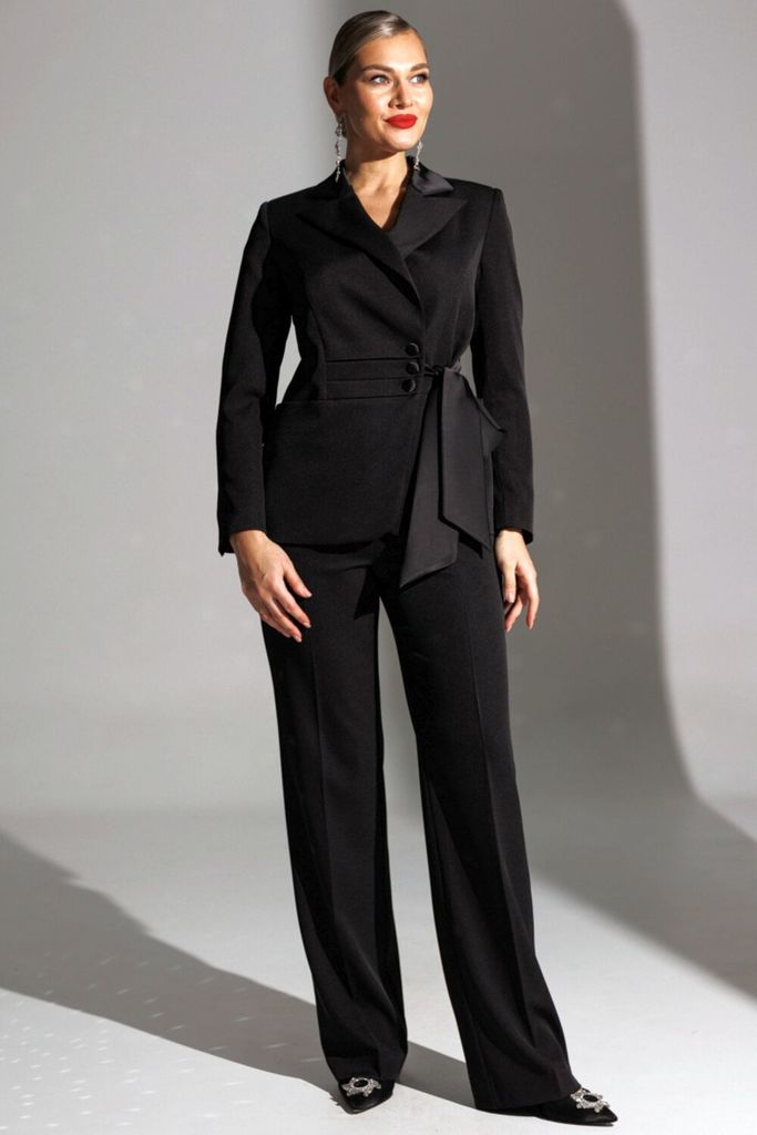 Состав: Вискоза-23%; ПЭ-75%; Спандекс-2%; Жакет полуприлегающего силуэта с двухбортной застежкой на три обтяжные из атласной ткани пуговицы и одной потайной. Край борта овальной формы, что придаёт жак... Показать описаниеету утонченность. По переду обработаны фигурные рельефы из проймы, также имеется горизонтальный подрез,в котором расположены карманы. На правой центральной части полочки - три складки, параллельные подрезу. Дополнительно с левой стороны завязывается атласный бант,что придает нарядность и особый шарм. Одна часть банта крепиться на пуговицу, другая в боковом шве. Спинка со средним швом и вертикальными рельефами из проймы. Воротник пиджачного типа из атласной ткани с пикообразными лацканами. Рукава двухшовные, со шлицей в локтевом шве на одну пуговицу, также обтяжную из атласа. Жакет на подкладке. Брюки классические,со стрелками,с притачным поясом-сзади частично на резинке для удобства и комфортной посадки. На поясе имеются пять шлёвок. На передних половинках присутствуют карманы. Застёжка на молнию и пуговицу. Костюм выполнен из качественной костюмной ткани с отделкой из атласа. Замеры 46-52: Жакет Длина спинки 67 67 67 67 Ширина спинки 38 39 40 41 Ширина на уровне глубины проймы 51 53 55 57 Ширина по линии талии 46 48 50 52 Длина рукава 62 62 62 62 Ширина по линии бедер 52 54 56 58 Ширина рукава вверху 17 18 19 20 Ширина плеча 11,8 13 13 13 Брюки Длина по боковому шву 109,5 109,5 109,5 109,5 Ширина по линии талии 43,5 45,5 47,5 49,5 Ширина по линии бедер 52 54 56 58
