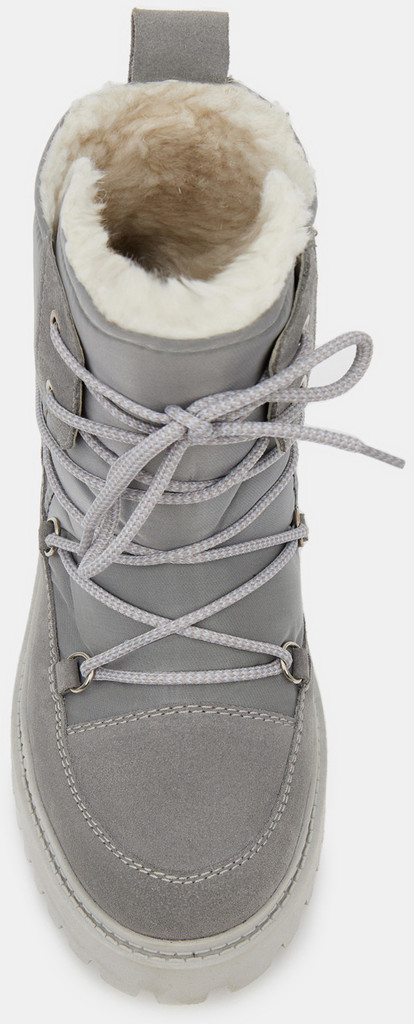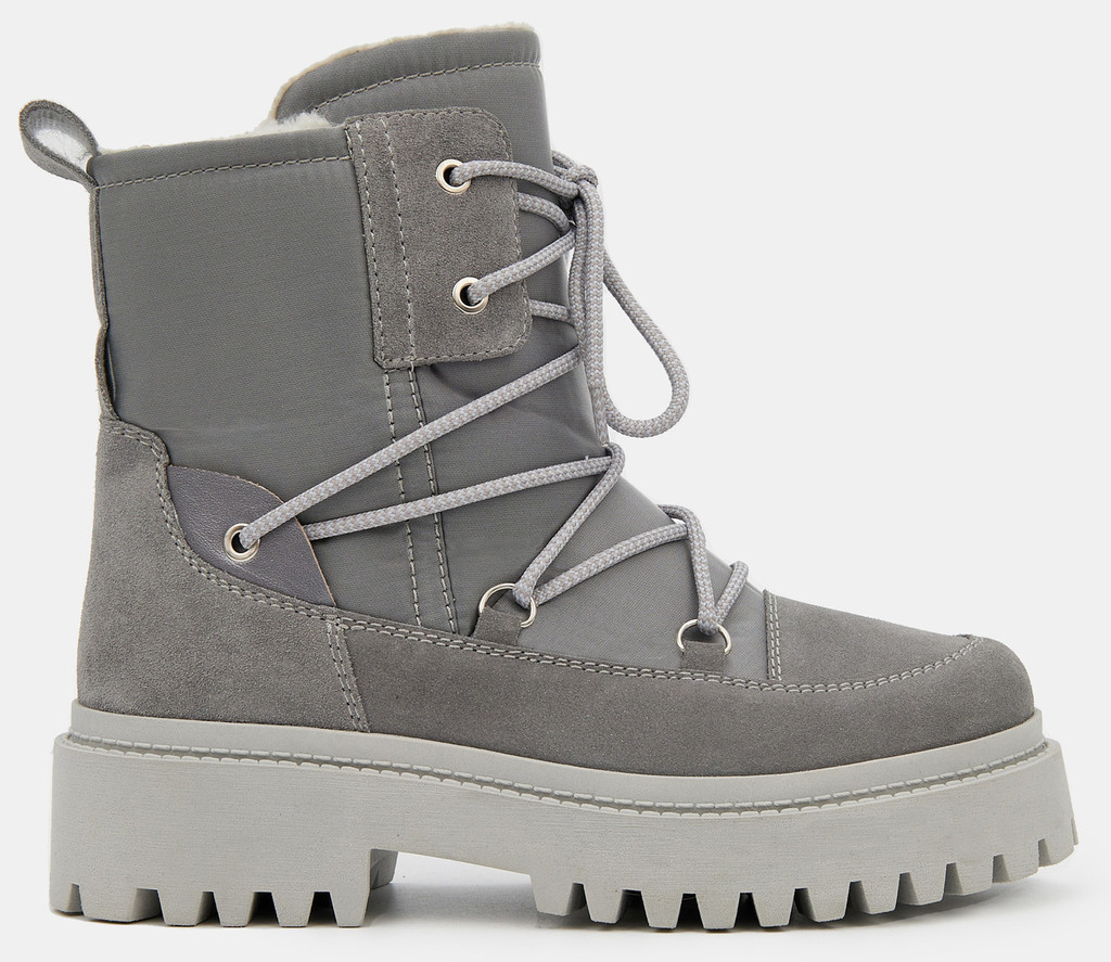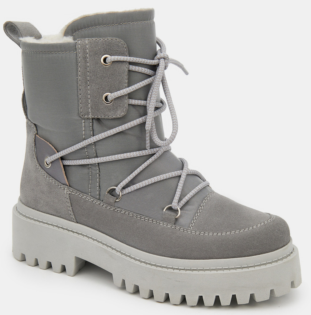 Больше картинок (информации) и таблица размеров на странице. Зимние женские ботинки серого цвета. Верх модели выполнен из сочетания кожи и технологичного текстиля. Подкладка и кожа утеплены натуральным мехом. Надежная ТЭП подошва амортизирует и отлично держит сцепление со скользкой дорогой. Теплые ботинки - правильный выбор на самые холодные и снежные дни. Материал верха: Текстиль Спилок Кожа Материал подклада: Мех (шерсть) Материал подошвы: Термоэластопласт