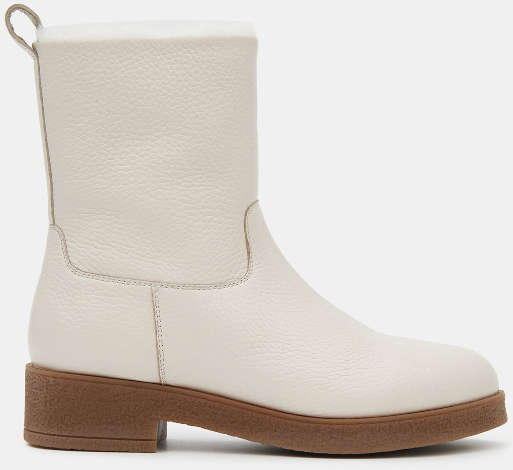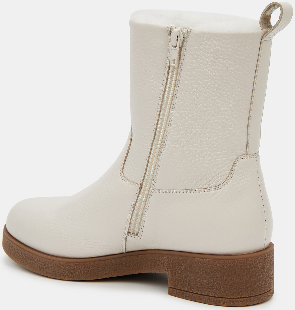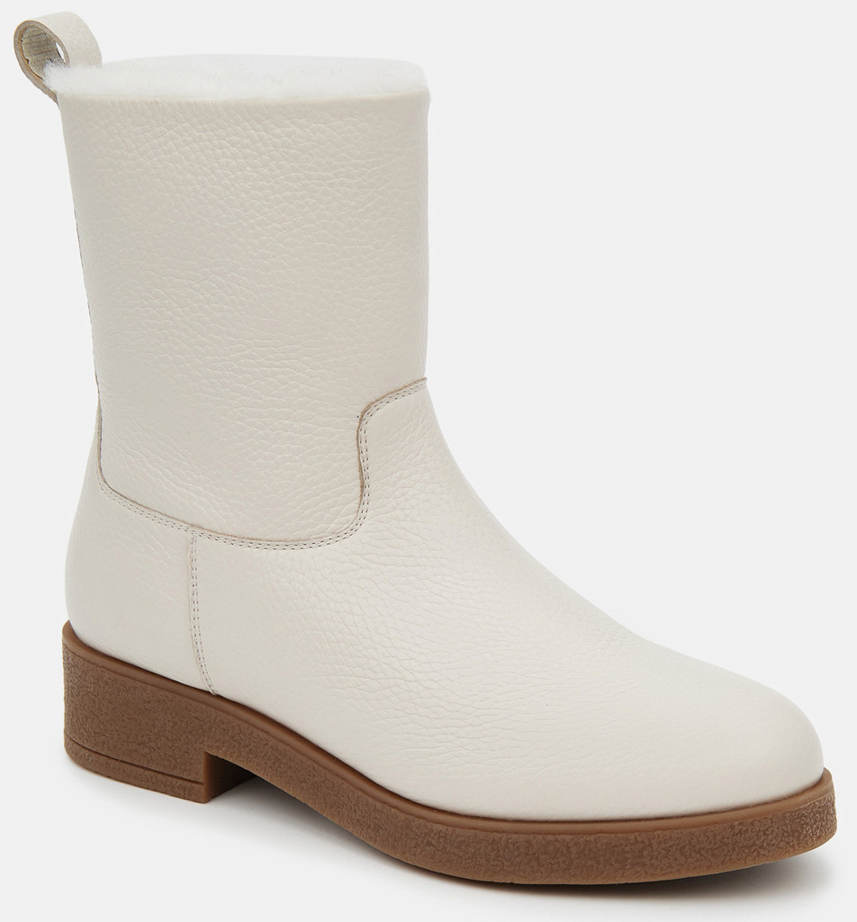 Больше картинок (информации) и таблица размеров на странице. Зимние женские ботильоны молочного цвета. Модель выполнена из качественной натуральной кожи. Подкладка и стелька утеплены натуральным мехом. Прочная контрастная ТЭП подошва отлично амортизирует и держит сцепление на скользких поверхностях. Светлые ботильоны дополнят зимний базовый гардероб. Удобная модель под любой casual образ. Материал верха: Кожа Материал подклада: Мех натуральный Материал подошвы: Термоэластопласт