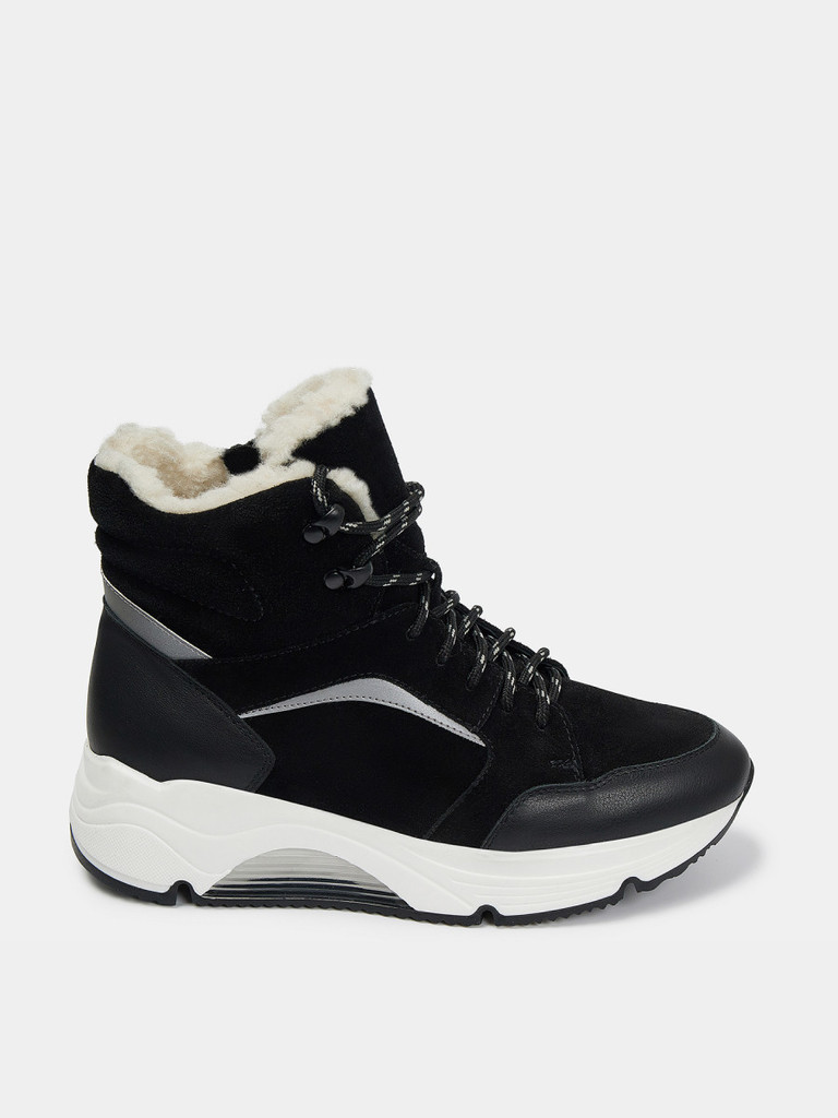 Больше картинок (информации) и таблица размеров на странице. Женские зимние кроссовки черного цвета. Верх модели выполнен из качественной натуральной кожи. Подкладка и стелька утеплены мехом. Анатомическая колодка обеспечивает ногам комфорт. Толстая подошва из термоэластопласта отлично амортизирует и имеет хорошее сцепление с любой поверхностью. Модные повседневные кроссовки дополнят зимний спортивный и casual образы.