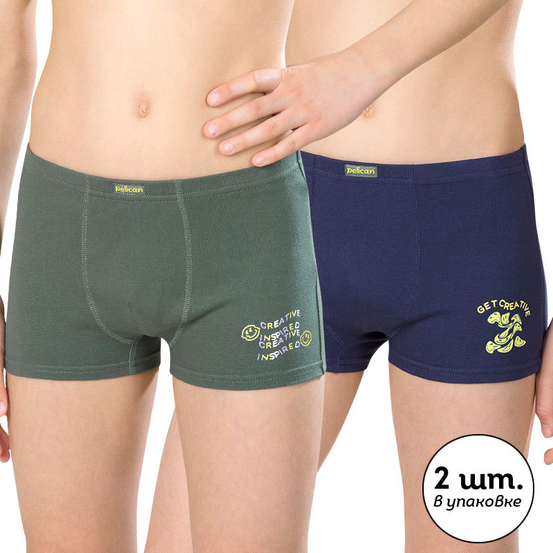 Состав: низ: 93%хлопок 7%эластан, низ2: 93%хлопок 7%эластанОписание: Pelican - производитель нижнего белья, представляет набор трусов-боксеров для мальчика, состав 93% хлопок, 7% эластан. Если вы ищет... Показать описаниее качественное нижнее белье для вашего подростка, то этот набор трусов точно понравится вам и вашему ребенку. Боксеры для мальчика - это набор подростковых трусов из 2-х штук, выполнены из ткани с высоким содержанием хлопка. Хлопковые трусики отлично пропускают воздух, а эластан в составе обеспечивает эластичность и долговечность. Качественная ткань и анатомически правильный крой гарантируют комфортную посадку нижнего белья на теле, а мягкая широкая резинка в поясе не давит и не перекручивается. Трусы-шортики сохраняют отличную форму в течение долгого времени, даже после многочисленных стирок. В комплект входят облегающие детские семейники, в двух вариантах расцветки: зеленые и темно-синие с прикольным принтом и надписью (перевод: «Будь креативным. Вдохновленный творчеством»). Молодежные труселя для парней с рисунком выполнены в спортивном стиле, в виде обтягивающих шорт. Такие транки для подростка предназначены для повседневного ношения, как нательное белье под одежду в школу или детский сад. Трусишки имеют комфортную классическую посадку, поэтому в них очень удобно заниматься спортом и физкультурой, бегом и каратэ, баскетболом и футболом. Хипстеры из коттона подойдут как для малыша, так и на мальчика подростка. Нижнее белье с анатомическим разделением из тонкого хлопка и плоскими швами позволит Вашему ребенку чувствовать себя максимально комфортно в течение всего дня в любое время года будь то лето или осень, зима или весна. Удлиненные плавки облегающие предназначены для детей в возрасте 1 и 2, 3 и 4, 5 и 6, 7 и 8, 9, 10 и 11 лет. Эту модель трикотажных бельевых трусов рекомендовано стирать при температуре не выше 30 °C, без предварительного замачивания, с изнанки. Не забывайте о выборе правильного размера. Используйте таблицу размеров на фотографии, чтобы выбрать подходящий вариант для вашего мальчика, сына или внука.