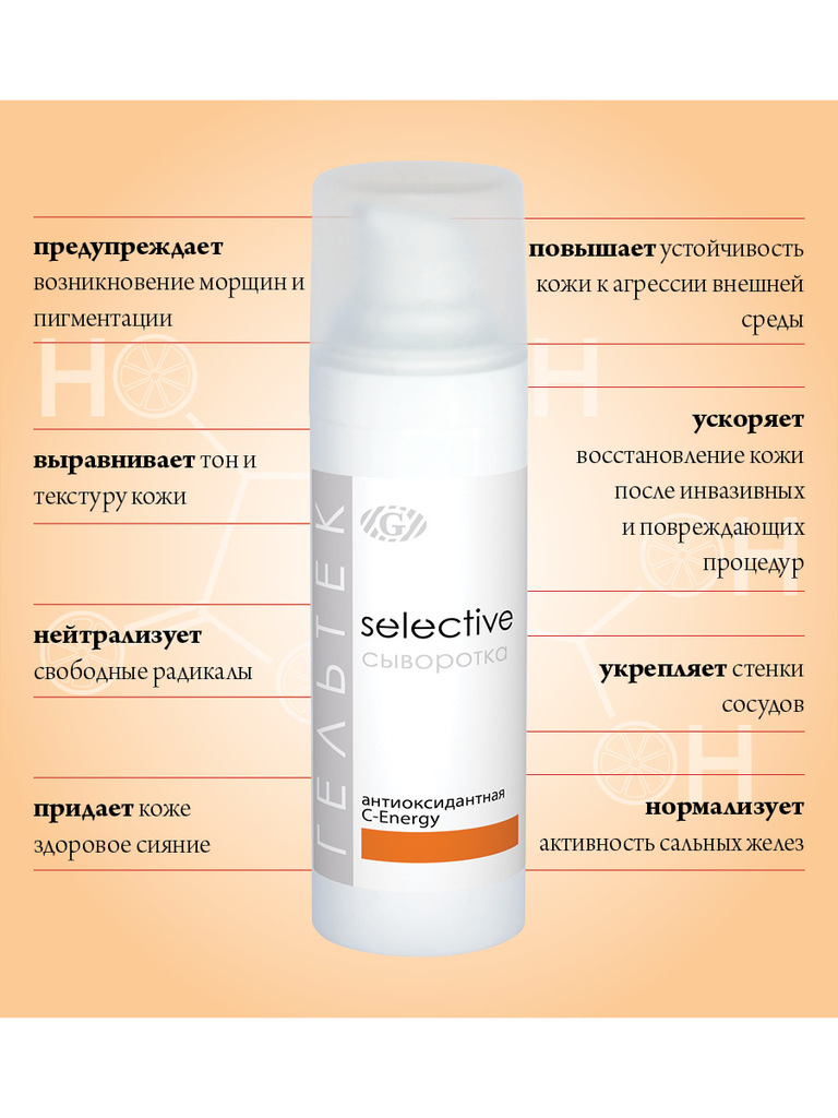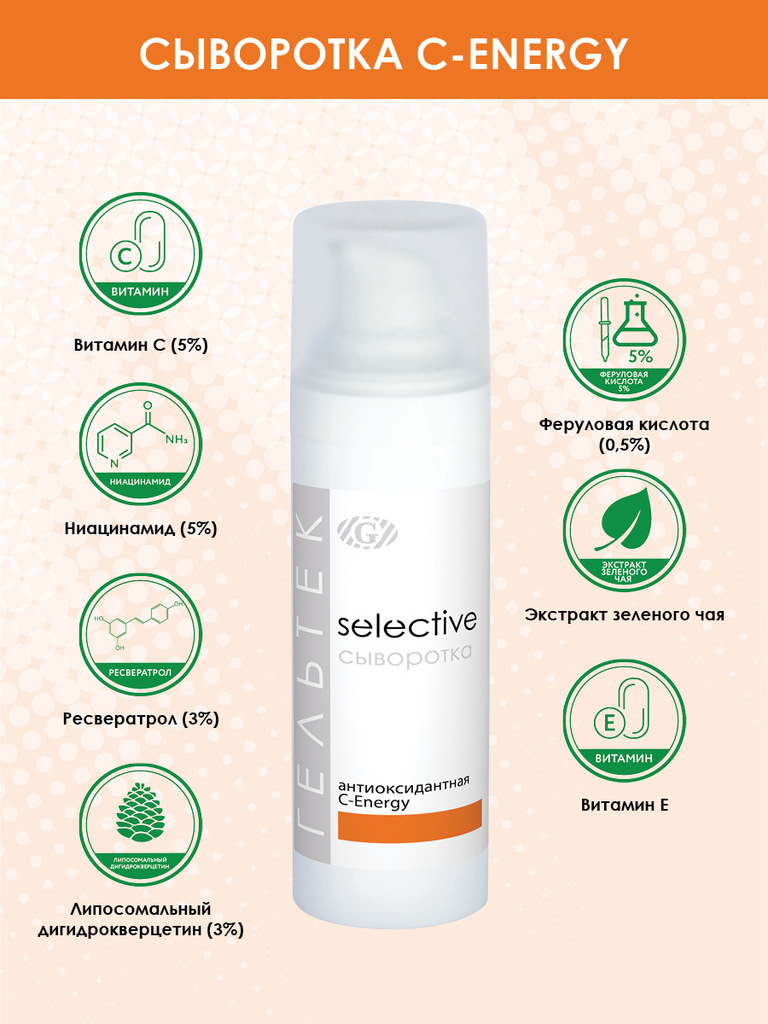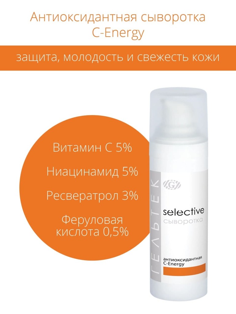Антиоксидантная сыворотка С-Energy станет идеальным средством для всех городских жителей и любителей солнца. Высокоэффективная антиоксидантная сыворотка с 5%-ным витамином С, находящемся в двух стабил... Показать описаниеьных формах, таких как инкапсулированный в липосомах аскорбил пальмитат и аскорбил глюкозид. Также средство содержит ресвератрол 3% , феруловую кислоту 0,5%, ниацинамид 5%, фосфолипидный комплекс с дигидрокверцетином 3%. Сыворотка имеет лёгкую, нежную, гелевую текстуру, повышает устойчивость кожи к UV- и IRA-излучению и негативному воздействию окружающей среды (озон, поллютанты, плохая экология), вызывающего окисление и, как следствие, повреждение клеток кожи. Средство обладает высокой концентрацией трёх самых мощных антиоксидантов — витамина С, ресвератрола и феруловой кислоты, которые придают ему омолаживающие и детоксицирующие свойства. Сыворотка разглаживает мелкие и глубокие морщины, осветляет тон кожи и снижает чувствительность. Ниацинамид регулирует активность сальных желез и уменьшает склонность к воспалениям. При регулярном применении кожа становится ровной по тону, сужаются поры, воспаления появляются реже, кожа становится менее реактивной. Область применения: профессиональный и домашний уход В домашнем уходе: применять на очищенную кожу 1-2 раз в день, самостоятельно, а также как основу под солнцезащитные средства, декоративную косметику. Наносить на очищенную кожу, распределяя легкими массажными или похлопывающими движениями до полного впитывания. В профессиональном уходе: рекомендуется под маски с эффектом окклюзии и как завершающее средство после кабинетных процедур под финальный крем. Во время применения сыворотки рекомендуем использовать средства SPF в дневное время. Применение: Показания к применению: профессиональный и домашний уход для всех типов кожи с возрастными изменениями, с признаками фотостарения и нарушенным тонусом. Для улучшения обновления кожи, усиления её фотозащитных свойств, уменьшения глубины мелких морщин, выравнивания тона, сужения пор. Для профилактики появления пигментных пятен. Форма выпуска: флакон 30 г.