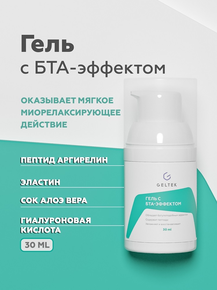 Гель эффективно и быстро решает проблему мимической активности - оказывает мягкое миорелаксирующее действие, уменьшая глубину морщин, интенсивно увлажняет кожу лица и возвращает ей бархатистость и упр... Показать описаниеугость. Один из активных компонентов геля - аргирелин - расслабляет мимические морщины, блокирует мышечную иннервацию за счет конкурентного ингибирования белков, которые участвуют в проведении нервного импульса. Происходит ослабления мимической активности - исчезают мимические морщины на лбу, во внешних уголках глаз, около рта. Алое вера в составе геля обладает иммуностимулирующим, противовоспалительным действиями, а гиалуроновая кислота создает воздухопроницаемую микропленку, удерживающую воду, защищающую кожу от агрессивного воздействия окружающей среды. Активные ингредиенты: аргирелин, эластин, сок алое вера, гиалуроновая кислота. Применение: ионофорез, электропорация, профессиональный и домашний уход.