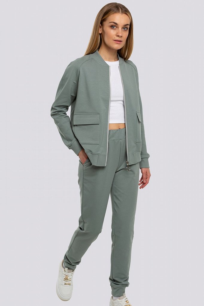 Cтиль спорт шик утвердился в списке самых популярных трендов и с тех пор не покидает пьедестал. Женский костюм в стиле спорт шик сочетает в себе привлекательность, выразительность и высокий уровень ко... Показать описаниемфорта. Локаничный, свободный свитшот с металлической молнией до уровня груди и воротником стойкой. На груди два накладных кармана с клапанами. Низ слегка выгнутой формы. Брюки среднего объёма, без лишних деталей, пояс на резинке, по низу манжеты. Состав трикотажа: 75% хлопок, 20% полиэстер, 5% спандекс.