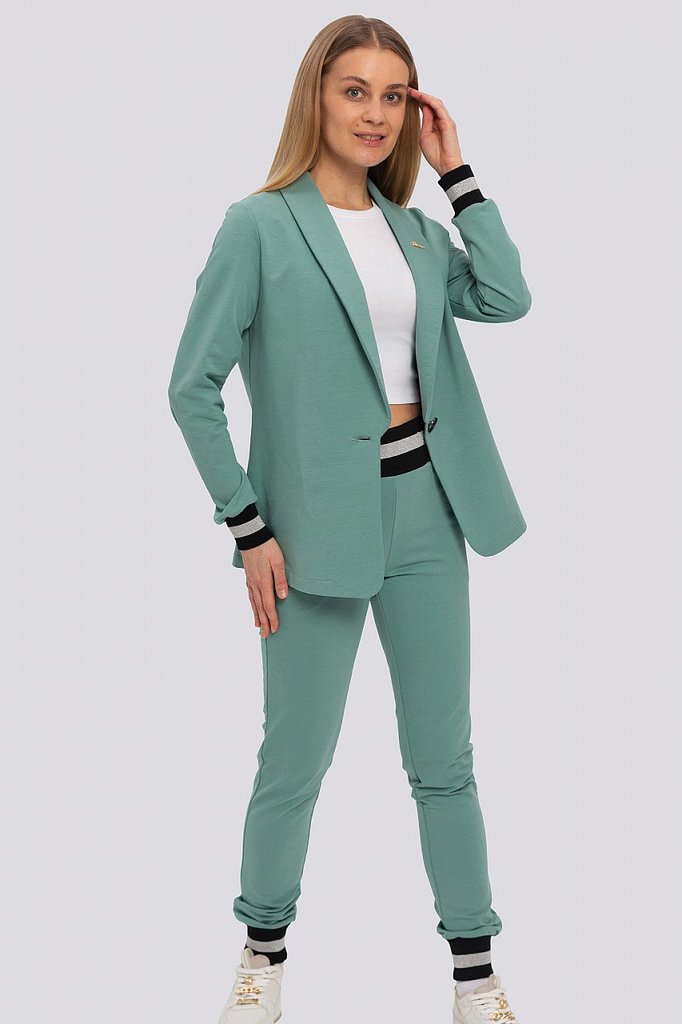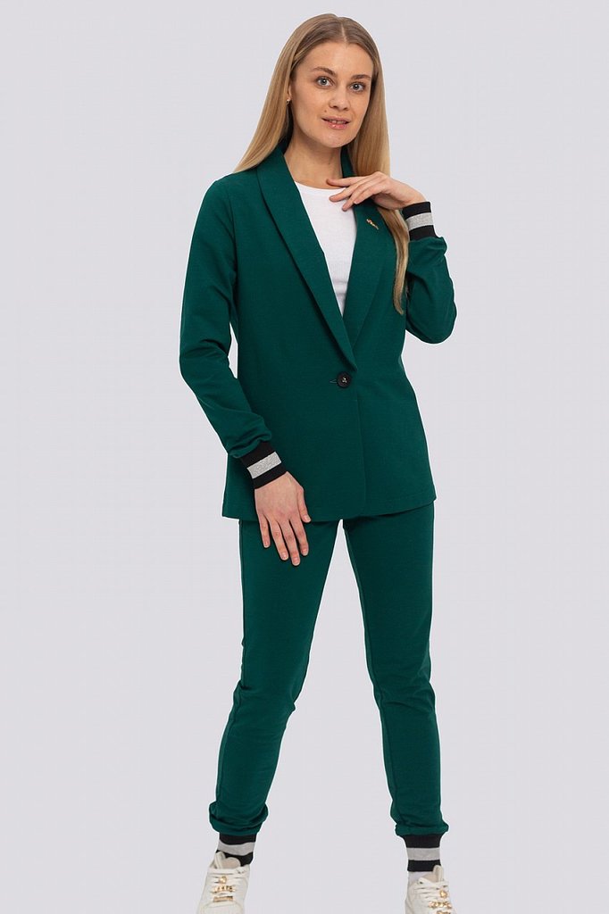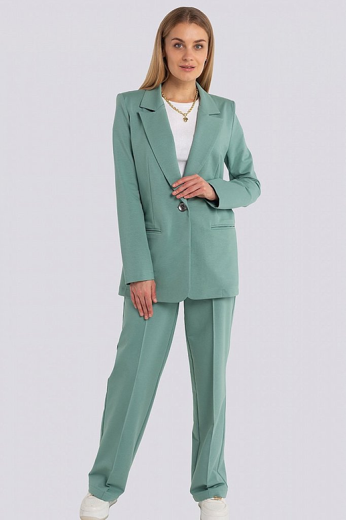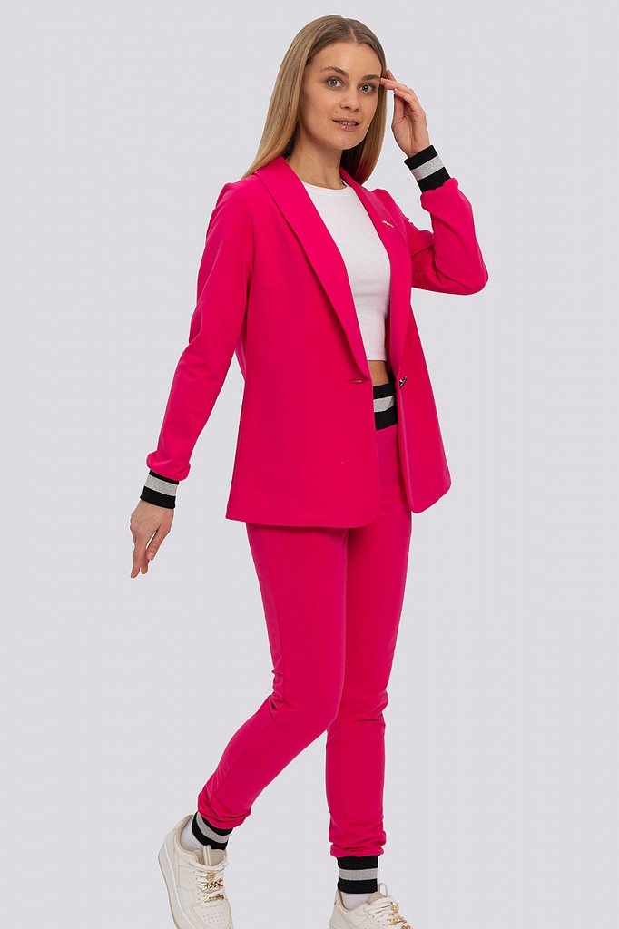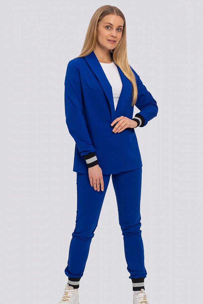 Классический костюм всегда был в моде, такие костюмы подходят всем, независимо от фигуры. Их можно носить с блузками, рубашками, для того, чтобы создать строгий образ. Для повседневного ношения можно ... Показать описаниенадеть свитер или топ. Современные женщины готовы носить модный костюм с брюками по любому поводу и это правильно. Более того, женский брючный костюм входит в топ вещей, без которых представить себе актуальный женский гардероб в сезоне 2023-2024 будет немыслимо. Жакет с воротником английского типа, свободного объема, полуприлегающего силуэта. Застежка на пуговицу, элегантные карманы в рамку. Брюки широкие, стрелка застрочена, со шлевками, пояс частично с резинкой. Посадка брюк – высокая, на талии. В очередной раз пришла в моду палитра сочных оттенков – фуксия, ярко-синий, зеленая мята – наш выбор. Модель представлена из трикотажной ткани, что предоставляет максимум комфорта в носке. Ткань не мнется, не вытягивается и не выгорает. Состав трикотажа: 75% хлопок, 20% полиэстер, 5% спандекс.