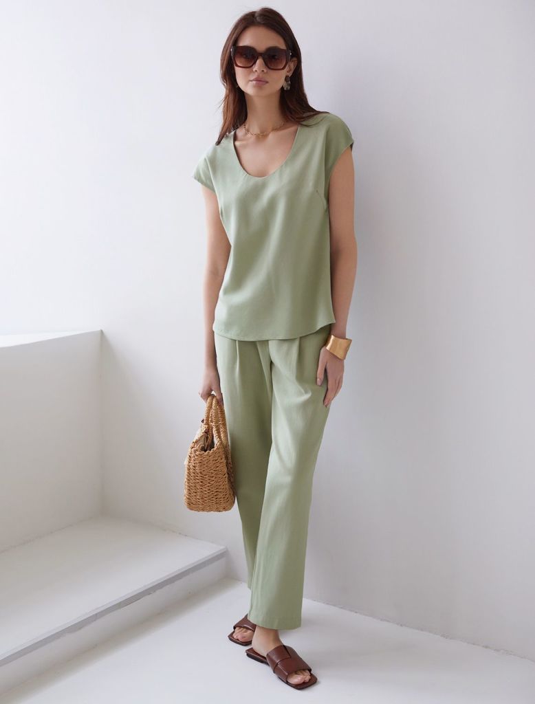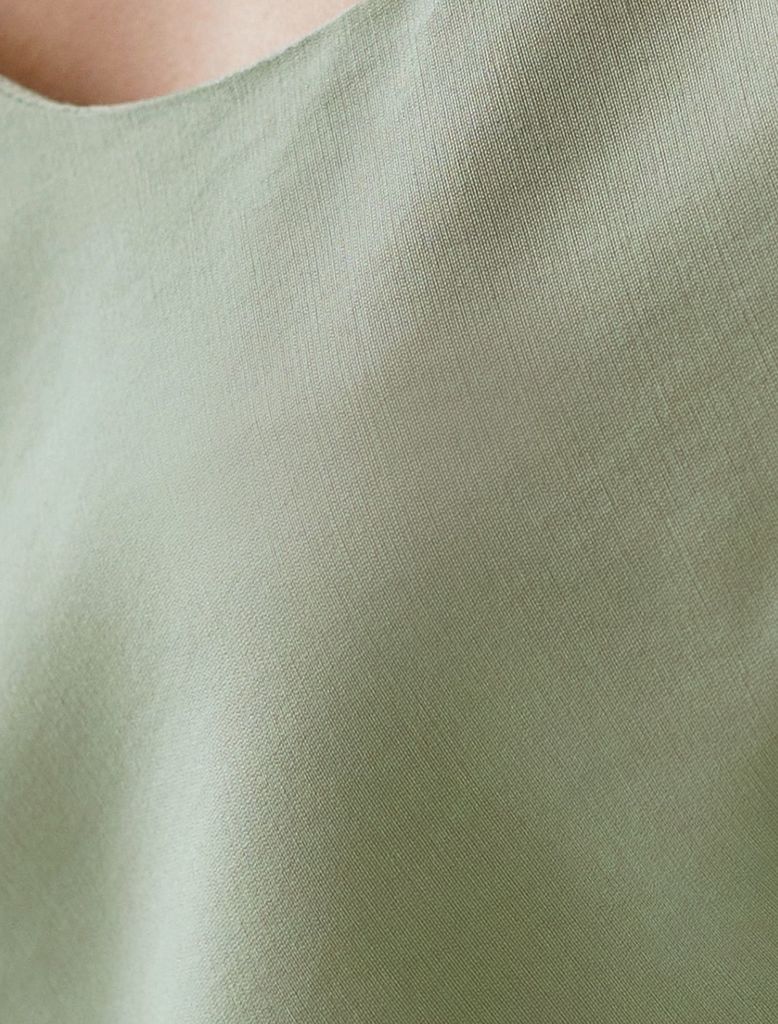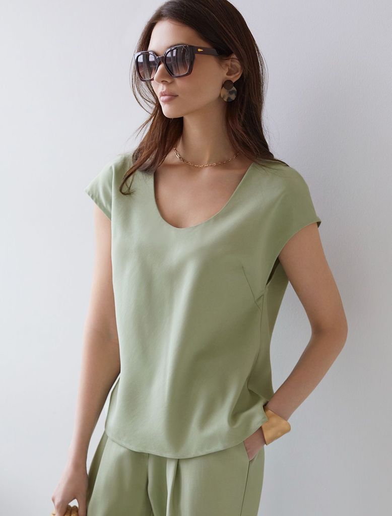 Состав: 76%Лиоцелл (Вис) 24%ПЭ Элегантная блузка светло-зеленого цвета скроенная по косой выполнена из плотного лиоцелла. Лиоцелл это более дорогой и экологичный вариант вискозы, очень прочный и шелко... Показать описаниевистый. Эта повседневная блузка с трендовым U-вырезом создана для легкого и утонченного стиля. Мягкие линии кроя создают невероятно эффектный образ, который подчеркивает естественную красоту, не стесняя движений, а свободный фасон дарит ощущение абсолютного комфорта и уверенности. Блузка красиво драпируется при движении, создавая летящий, воздушный эффект. Эта легкая блуза с коротким рукавом идеальный выбор для комфорта и стиля в теплое время года, она будет идеальна для любого повода. Реомендуем сочетать с артикулами: D24.310, D24.311, D26.203