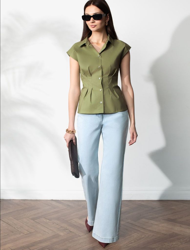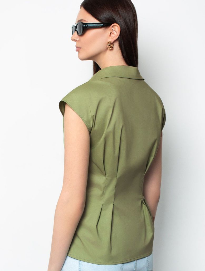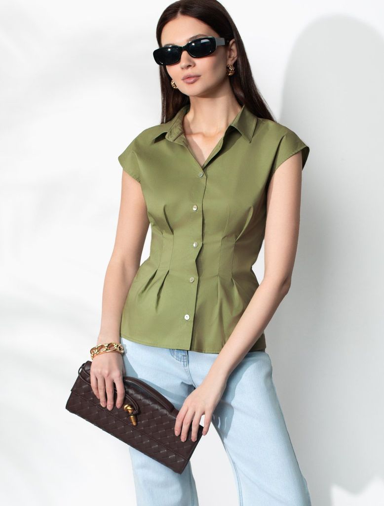 Состав: 77%Хлопок 20%ПЭ 3%ПУ Плотность: 96 Г/м2 Изысканная женственная блузка оливкового цвета выполнена из легкого хлопкого поплина плотностью 96 Г/м2 и будет идеальна для создания комфортного и крас... Показать описаниеивого образа в теплое время года. Натуральный материал отличается мягкостью и воздухопроницаемостью, что особенно ценно в жаркую погоду, а эластан в составе позволяет сохранить форму изделия. Основное преимущество повседневной блузки — аккуратный приталенный силуэт, подчеркивающий достоинства фигуры и создающий акцент на линии талии. Короткий цельнокроеный рукав придает образу свежесть и легкость. Однотонная рубашка с отложным воротничком подойдет для работы в офисе, встреч с друзьями, прогулок, для особого случая или праздника. Лаконичная легкая блузка отлично сочетается с разнообразными элементами гардероба, благодаря ей можно создать классический или романтичный образ.