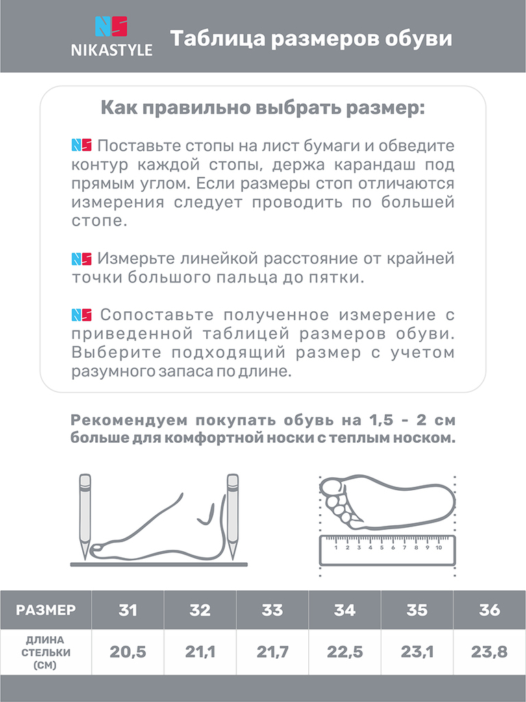 Стильная модель ботинок от бренда NIKASTYLE БУТСЫ для любой осенне-весенней погоды. Ботинки изготовлены из прочных и качественных материалов: натуральная замша и высококачественная экокожа - гипоаллер... Показать описаниегенный и воздухопроницаемый материал. Технология WATERPROOF с использованием мембранных материалов, которые не пропускают влагу внутрь обуви, но позволяют ногам дышать и подойдут для влажной и слякотной погоды. Внутренняя подкладка обеспечивает тепло и комфорт, что особенно актуально в холодное время года. Анатомическая форма стельки способствует правильному формированию свода стопы, равномерно распределяет нагрузку, уменьшает усталость, обеспечивает правильное развитие стоп. Липучка и эластичные шнурки позволяют точно настроить полноту и обеспечивают легкое одевание. Ботинки имеют спортивный дизайн, что делает их универсальными для школы и спортивных мероприятий. Подошва с протектором выполнена из термопластичной резины (TPR), обладает высокой износостойкостью и хорошей амортизацией, уменьшая нагрузку на ноги. Ботинки оснащены съемной стелькой со специальной маркировкой, позволяющей правильно подобрать размер. Рекомендуем вынуть стельку и приложить к ней ногу ребенка - пальцы должны располагаться в обозначенной для этого области. При выборе обуви для ребенка, длина стельки должна быть примерно на 1-1,5 см больше, чем длина стопы. Отличный вариант