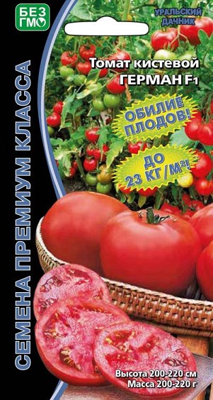 Гибрид ГЕРМАН – настоящий дамский угодник. Высокий (200-220 см), статный, хорошо сложенный – вскружит голову кому угодно. А какой он любитель удивлять подарками – пурпурно-малиновыми, крупными (по 200... Показать описание-220 г) плодами, превосходного вкуса. Герман F1 – раннего срока созревания, после всходов вступает в плодоношение уже через 93-95 дней. Невероятные урожаи вам гарантированы, если будете уделять этому соблазнителю должное внимание. Так, в первые два сбора с одного квадратного метра можно получить свыше 9 кг аппетитнейших, красивейших, обалденно-вкусных помидоров. И такой результат только в начале плодоношения. Потенциальная же урожайность гибрида – 20-23 кг/м2. Растение индетерминантное (не ограниченное в росте), крепкое, слабооблиственное, имеет простую кисть, в которой, как правило, по 6-8 томатов, обладает сильным иммунитетом к альтернариозу и вирусу табачной мозаики. Первая кисть закладывается над 6-7 листом, последующая – через 1-2. Плоды округлой формы, очень крепкие, плотные, поэтому прекрасно переносят любую транспортировку. Каждый раз при поедании свежего салата или нарезки, вы будете получать истинное кулинарное наслаждение от этого томатного «бойфренда».
