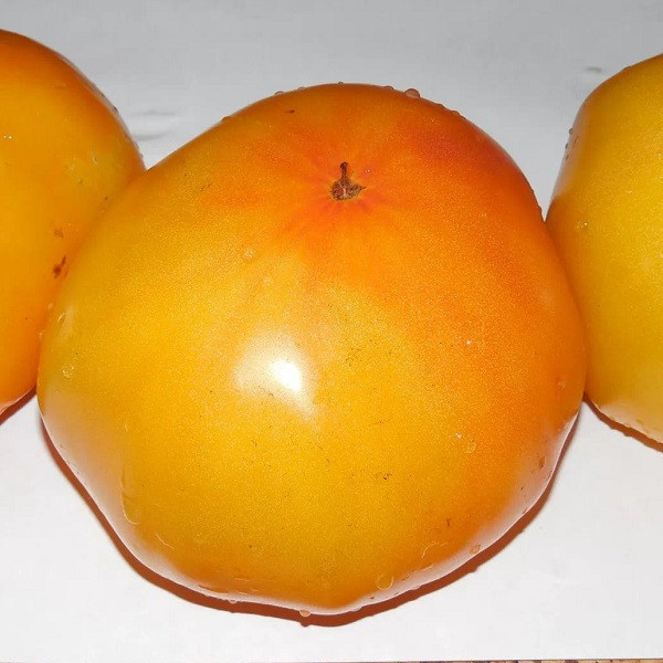 Очень красивые жёлто-оранжевые сердца в среднем по 200г. Мякоть плотная. Куст высокорослый. Вкус томатный.