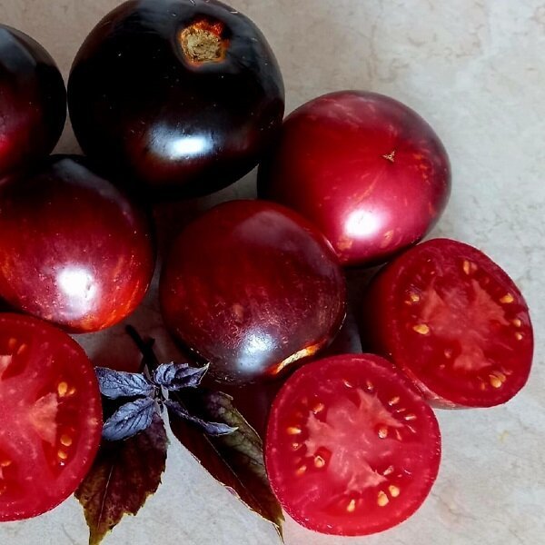 Сорт индетерминантный, среднерослый (1,3-1,7 м), среднеранний. Для теплиц и ОГ, формировать лучше в 2-3 стебля. Плоды очень красивые-пурпурной окраски с антоциановыми плечами и крупными разводами по в... Показать описаниесей поверхности, массой 120-150 граммов. Мякоть густая, тёмно-пурпурного цвета, сладко-терпкого вкуса.