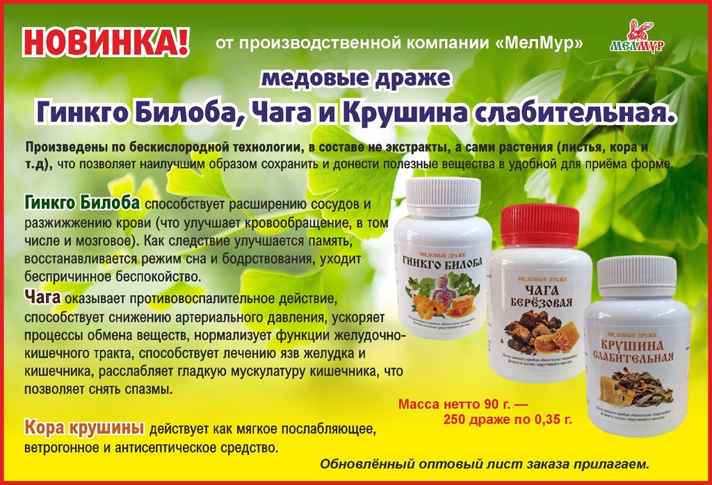 Крушина слабительная - кустарник около 3 м высоты. Она распространена в Европе, Западной Сибири, Средней Азии и на Кавказе. В коре крушины содержатся органические кислоты, эфирное масло, каротиноиды, ... Показать описаниеалкалоиды, дубильные вещества, флавоноиды, ароматические соединения, антрахиноны, высшие жирные кислоты. Кора крушины действует как мягкое послабляющее, ветрогонное и антисептическое средство. Эффект проявляется через 9-11 часов после принятия. Также она используется при диатезе, нервных расстройствах, экземе, ревматизме и других болезнях суставов. Медовые драже «МЕЛМУР» сочетают в себе пользу целебных растений и натурального цветочного мёда. Благодаря специальной бескислородной технологии производства, природные вещества, содержащиеся в сырье, не подвергаются окислению. В качестве сырья используются не растительные экстракты, а сами растения (листья, семена, кора, ягоды и т.д). Цветочный мёд обладает общеукрепляющим, восстанавливающим действием, оздоравливает сердечно-сосудистую систему, почки, печень, желчные пути, желудочно-кишечный тракт. Обусловлено это его уникальным составом, так как в процессе переработки нектара пчёлы насыщают его ферментами, органическими кислотами и липидами. Также мёд является натуральным консервантом. Всё это позволяет в удобной для приёма форме (в виде драже) получать биологически ценные вещества, необходимые для крепкого здоровья и хорошего самочувствия. Состав: кора крушины слабительной - 47 %, мёд цветочный - 31,2%, сорбитол - 20%, лецитин - 1%, кальция стеарат -0,8 %. Применение: по 1-6 драже 1-2 раза в день. Запивать водой. Упаковка: 250 драже по 0,35 гр. Срок годности: 24 мес.