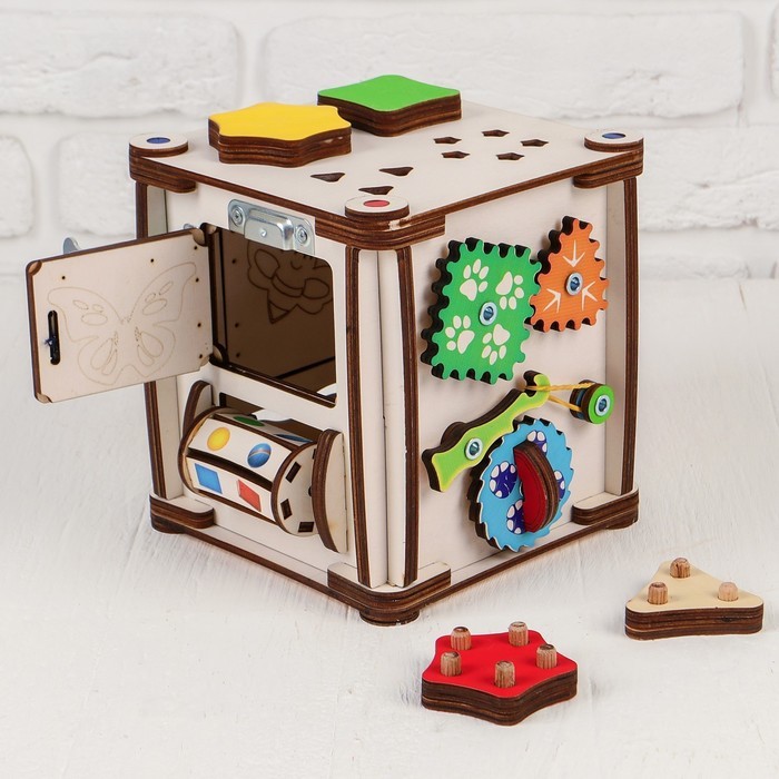 Развивающий Бизидом «Малыш» — обеспечит всестороннее развитие ребёнка и помогает родителям уберечь его от травмоопасных ситуаций на этапе освоения окружающего мира. Способствует интеллектуальному и фи... Показать описаниезическому развитию ребёнка. Преимущества: * Деревянные детали имеют приятную на ощупь текстуру, развивают тактильное восприятие ребенка, а яркие детали игрушки привлекают внимание малыша, формируют познавательную активность и создают положительный эмоциональный фон. * Развивает мелкую моторику: шнуровка, застежки, замки, шестеренки и другие элементы тренируют ловкость и координацию пальчиков. * Формирует полезные навыки: играя с бизидомом, ребенок учится различать цвета, формы, ориентироваться в пространстве, развивает логическое мышление и причинно-следственные связи. * Стимулирует любознательность: множество интересных деталей и интерактивных элементов надолго увлекут вашего малыша и помогут ему познать мир. * Развивает внимание и усидчивость: игра с бизидомом учит ребенка концентрироваться на задачах и доводить дело до конца. Что входит в комплект: 1. Элементы для развития мелкой моторики: шнуровка, застежки, шестеренки, лабиринты; 2. Развивающие элементы: пазл, спиннер, пайетки, шестеренки с бисером, вилка с розеткой, молния, фастекс, дверцы, крючок, бусинки; 3. Интерактивные элементы: лабиринты для развития навыков письма. Развитие: * Мелкой моторики, * Внимательности, * Координации движений, * Пространственного и логического мышления, * Любознательности, * Память, * Воображение, * Эмоциональный интеллект, * Сенсорное восприятие, * Творческие способности. Сделайте подарок, который надолго останется в памяти вашего малыша! Рекомендовано для детей от 3 лет. Дополнительно Размер в собранном виде: 27,5 x 25 x 25 см.