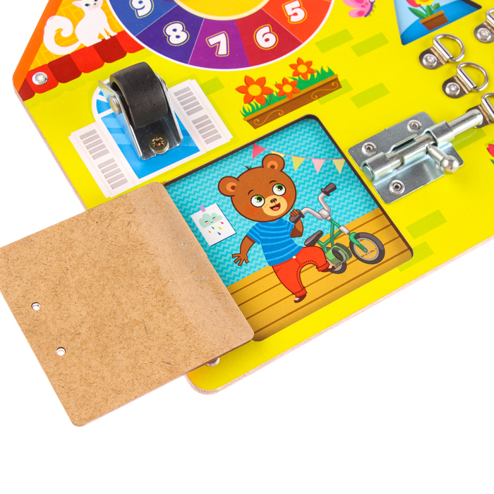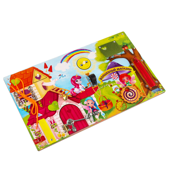 Бизиборд - игрушка, которая опробована педагогами, разработчиками методик обучения, а также непосредственно родителями малышей. Бизиборд - доска, в процессе игры с которой ребёнок будет познавать мир,... Показать описание ознакомится с предметами быта, а также получит навыки самообслуживания (завязывание шнурков, застёгивание молнии и мн.др). Несомненные плюсы бизиборда: * изучение различных свойств предметов; * формирование навыков открывания и закрывания различных замков; * развитие мелкой моторики и самостоятельности. 10 тактильных элементов: * фетровое окошко * колесико * колокольчик * липучки * 2 рамки-вкладыша * шнуровка * молния * крючок * колесо
