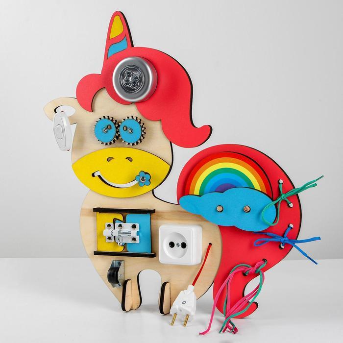 Бизиборд «Единорог» — это обучающая и занимательная игрушка, необычный подарок для любознательных малышей, который развивает воображение и творческое мышление. Эта оригинальная доска выполнена в виде ... Показать описаниеяркого единорога, который знакомит ребёнка с бытовыми предметами. Глазки сделаны из шестерёнок, рот — в виде лабиринта, на ушке серёжка — маленький выключатель светильника, а на хвосте размещены пазл-радуга и шнуровка. Все эти детали игрушки тренируют маленькие пальчики, безопасно обучают обращению с прототипами этих предметов в быту, тренируют концентрацию внимания и усидчивость у малыша. Уделяйте внимание развитию мелкой моторики малыша. Дети с развитой моторикой раньше начинают говорить и опережают своих сверстников в интеллектуальном развитии.