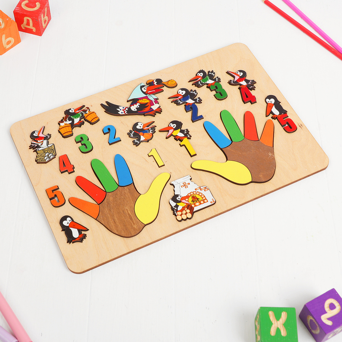 Бизиборд поможет вам в игровой форме обучить малыша счёту, познакомить с понятиями «левый» и «правый». Также кроха узнает названия всех пальчиков. А весёлые фигурки птенцов позволят ярко преподнести п... Показать описаниеотешку про сороку-белобоку. Доска и фигуры сделаны из прочного и экологичного материала — дерева, поэтому игрушка прослужит долго. Размер дощечки: 37 x 24,5 x 0,7 см. Толщина вкладышей: 5 мм.