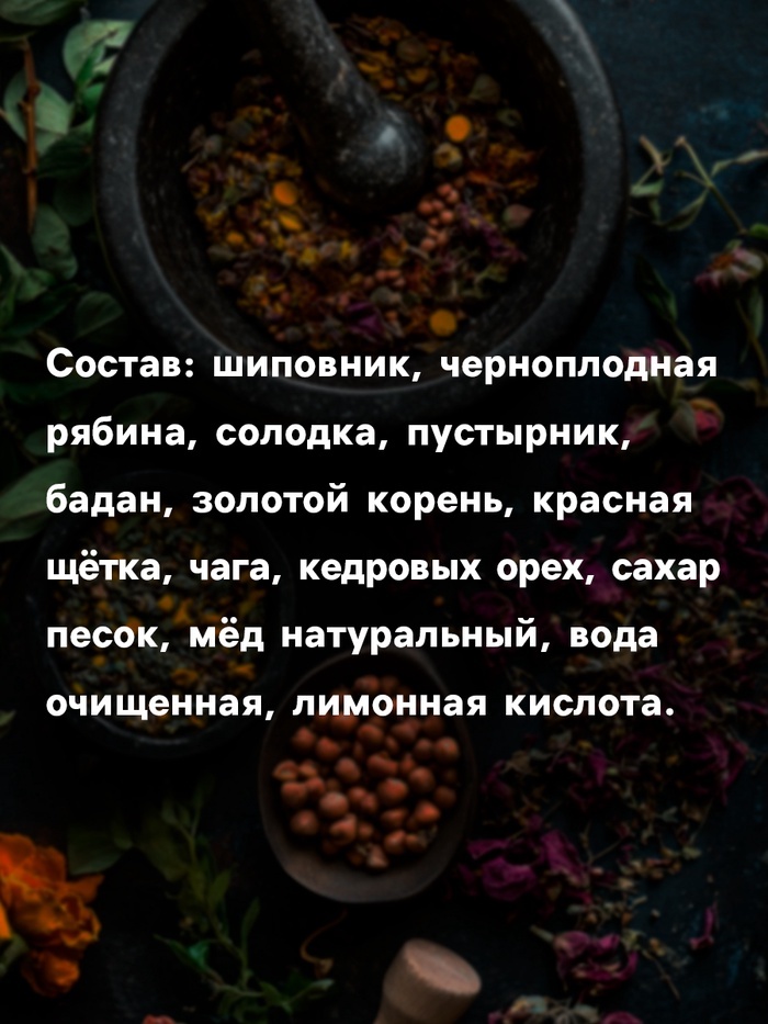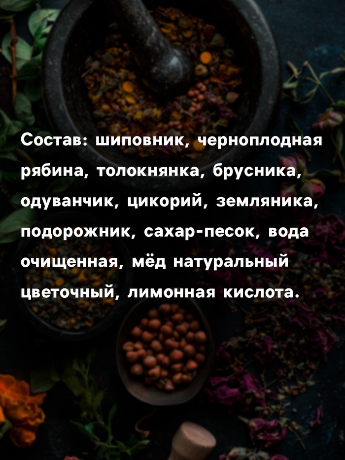 ПРИ ОФОРМЛЕНИИ ЗАКАЗА, ПРОСИМ ЗАПРАШИВАТЬ АКТУАЛЬНЫЕ СРОКИ ГОДНОСТИ У МЕНЕДЖЕРА Состав: шиповник, черноплодная рябина, цикорий, одуванчик (корень), крапива, имбирь, мята, девясил, полынь, расторопша, ... Показать описаниепижма, сахар-песок, вода очищенная, мёд натуральный цветочный, лимонная кислота. Срок годности: 2 года Объем: 250 мл Способ применения: употреблять по 1–2 ч. л. в чистом виде, с чаем, соками, минеральной водой и другими напитками.