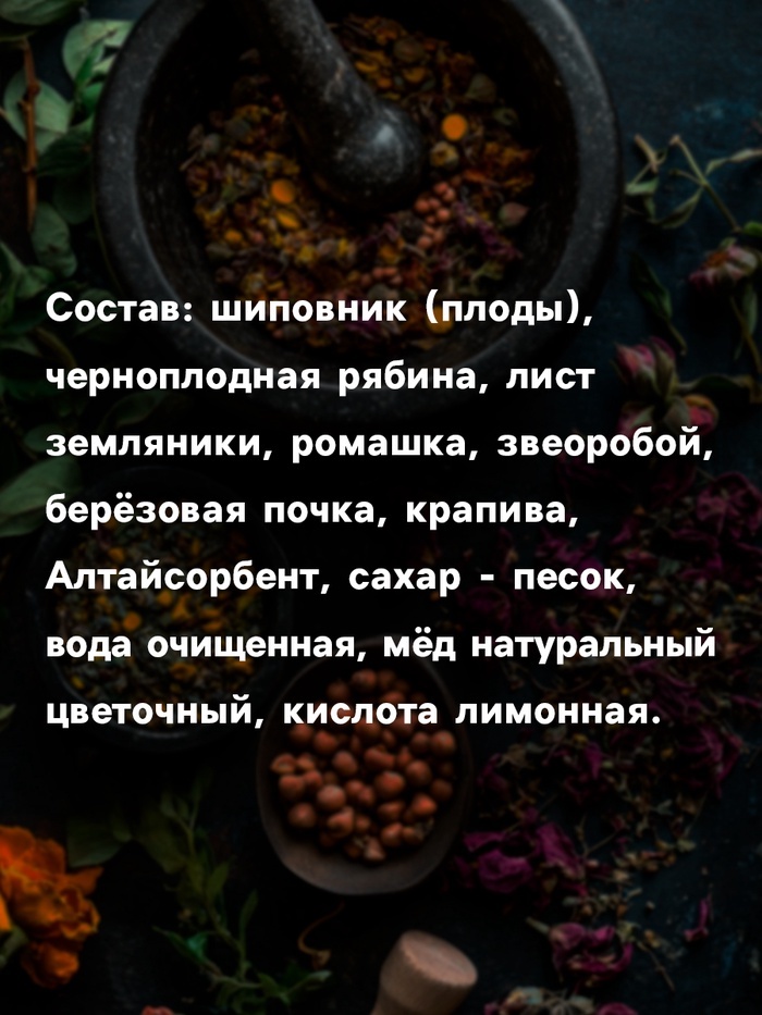 ПРИ ОФОРМЛЕНИИ ЗАКАЗА, ПРОСИМ ЗАПРАШИВАТЬ АКТУАЛЬНЫЕ СРОКИ ГОДНОСТИ У МЕНЕДЖЕРА Состав: шиповник, черноплодная рябина, толокнянка, брусника, одуванчик, цикорий, земляника, подорожник, сахар-песок, вод... Показать описаниеа очищенная, мёд натуральный цветочный, лимонная кислота. Срок годности: 2 года Объем: 250 мл Способ применения: употреблять по 1–2 ч. л. в чистом виде, с чаем, соками, минеральной водой и другими напитками.