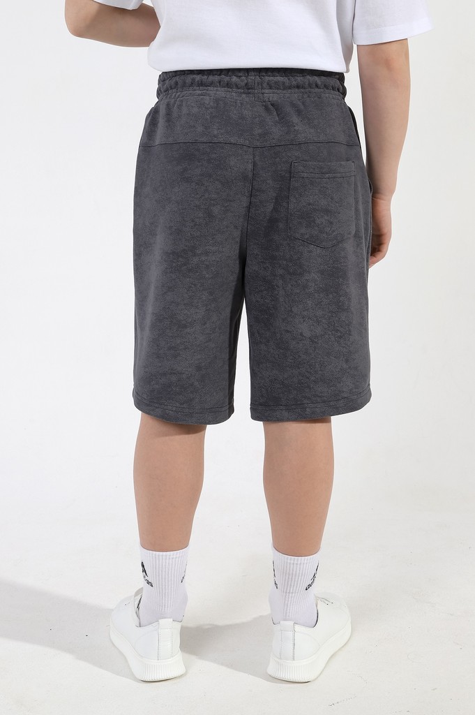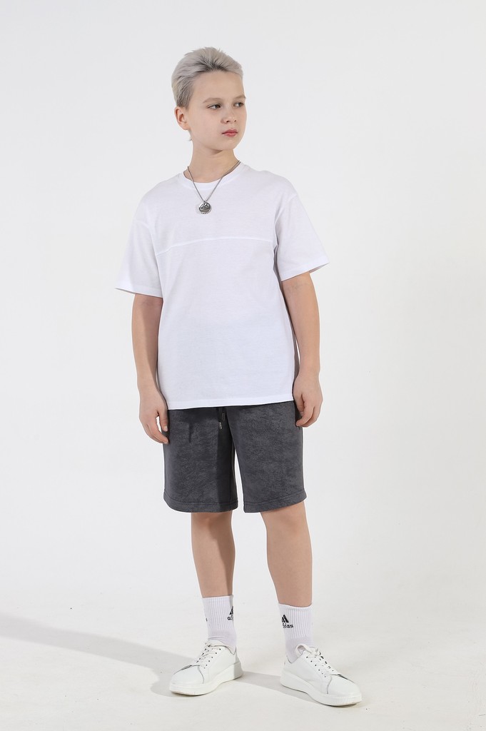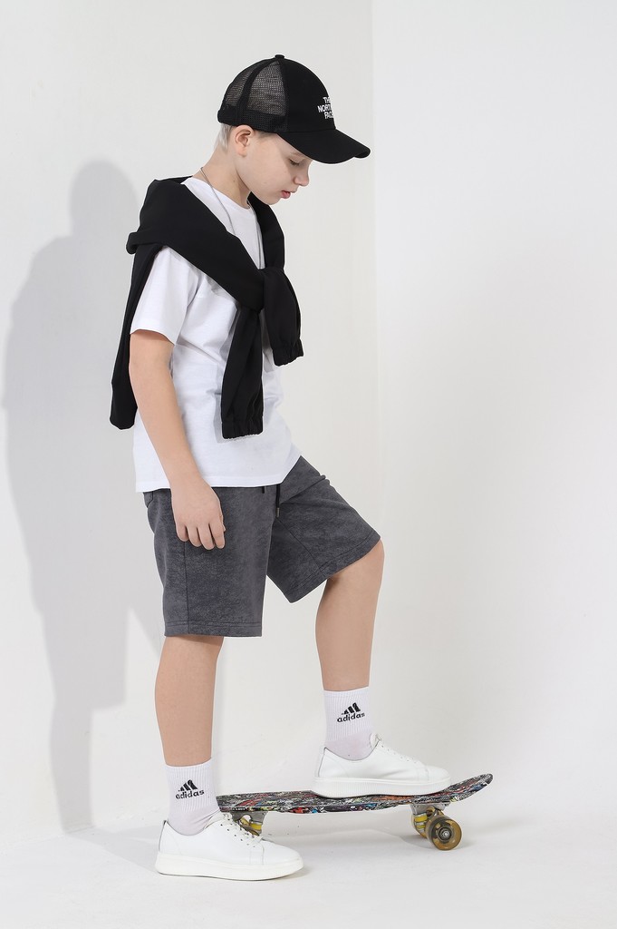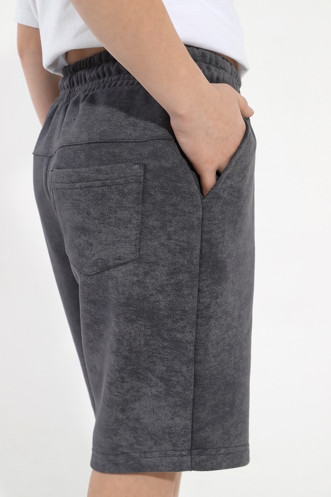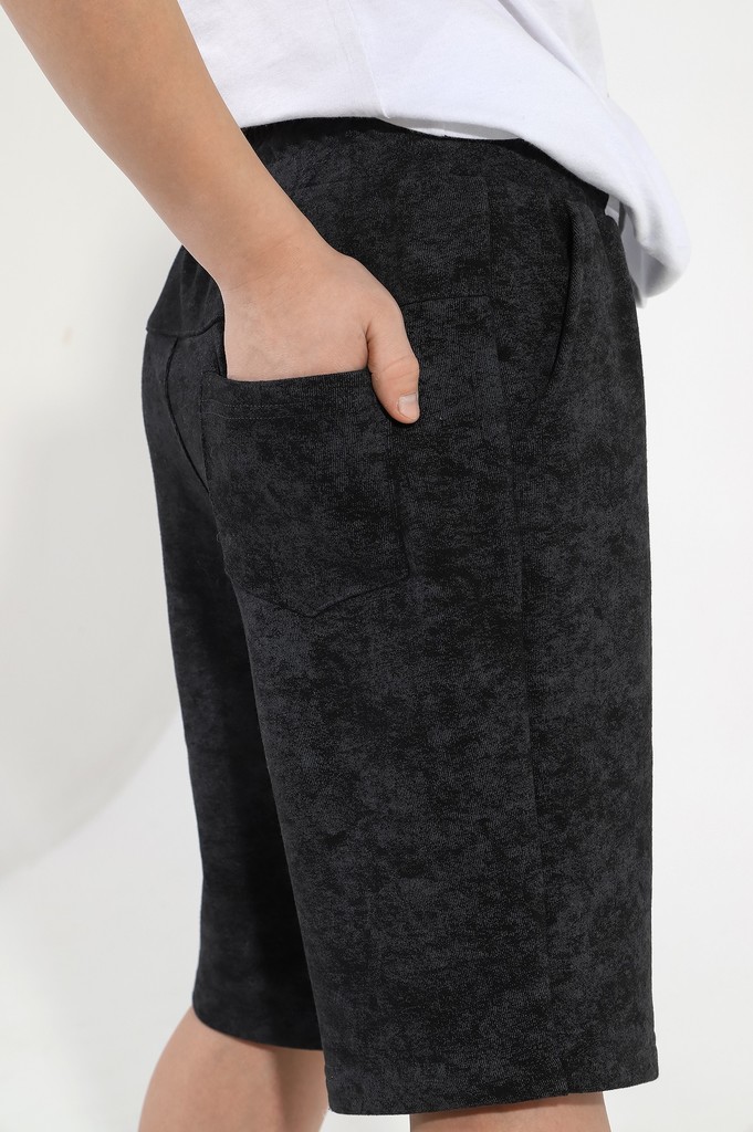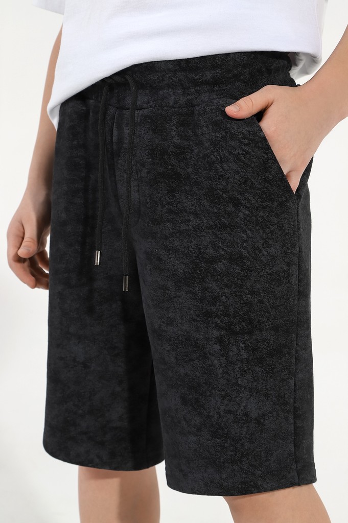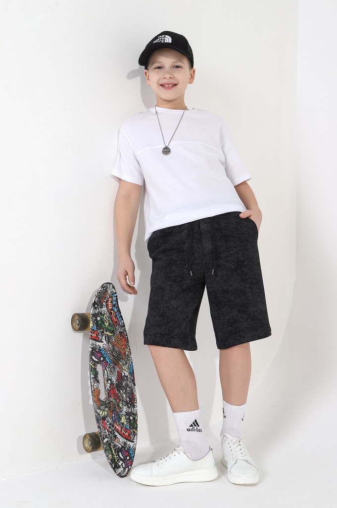 Шортыдля мальчика из трикотажного полотна "футер-трехника -петля", на притчном поясе с эластичной тесьмой внутри, с карманами в боковых швах и имитацией застежки "гульфик". В центре пояса - две обмета... Показать описаниенные петли, чере которые продет шнурок с наконечниками для регулирования степени прилегания шорт по талии.
