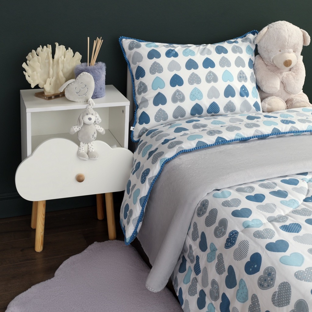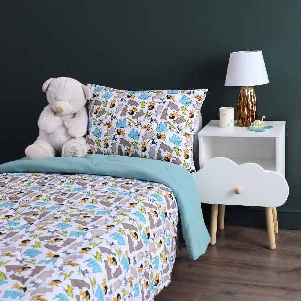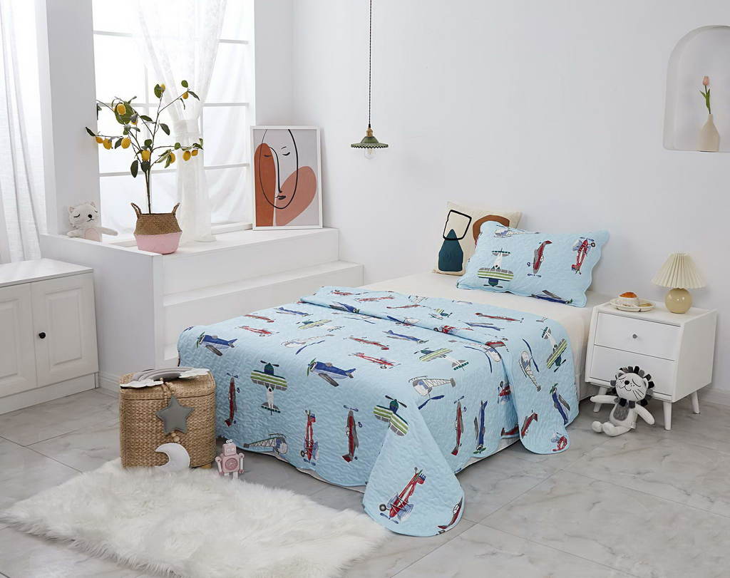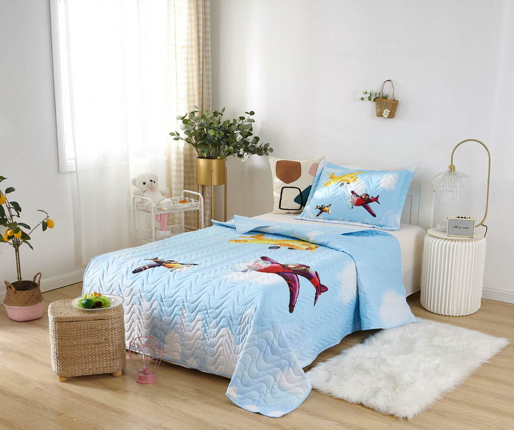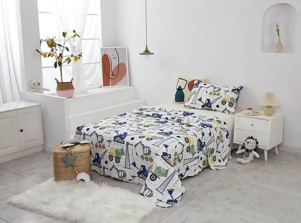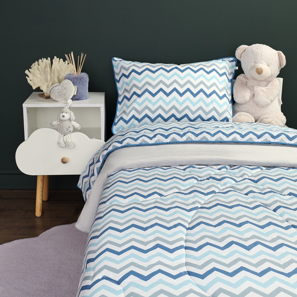 Комплект с одеялом : Одеяло 160х220 см (1) Простыня на резинке 90х190 см (1) Наволочка 50х70 см (1), наволочка на молнии. Состав: 100% хлопок, трикотаж Уход : деликатная стирка Упаковка: ПВХ упаковка