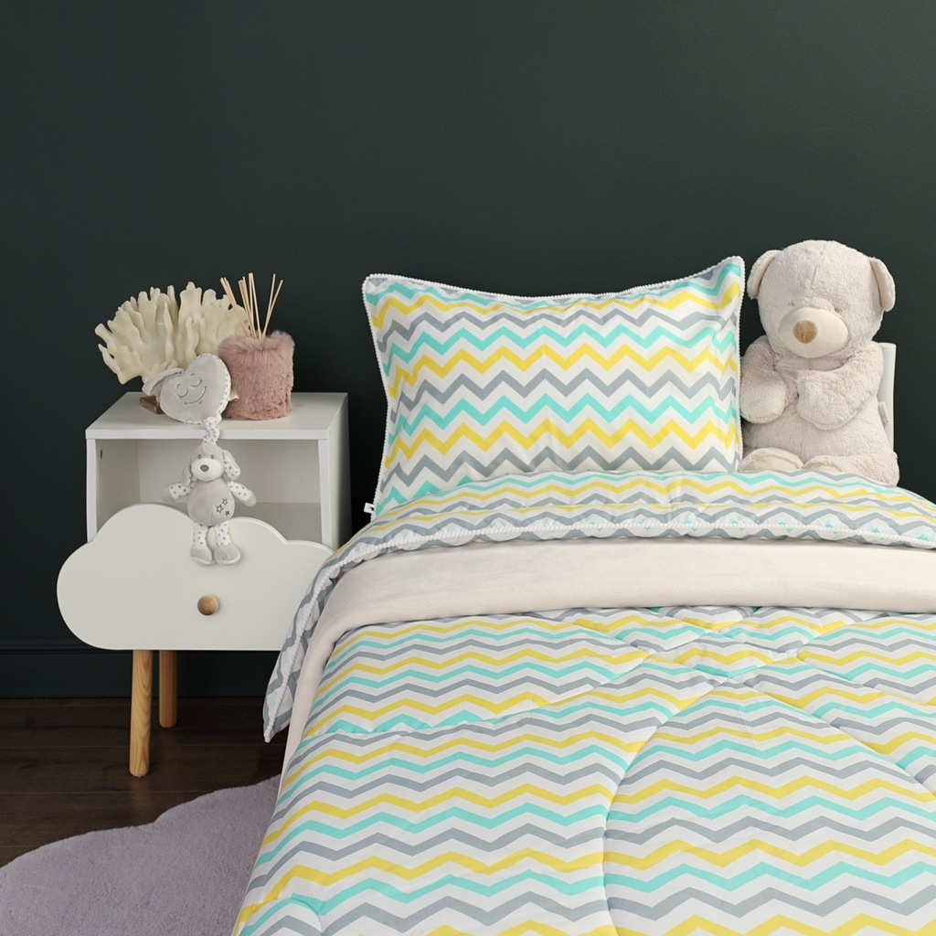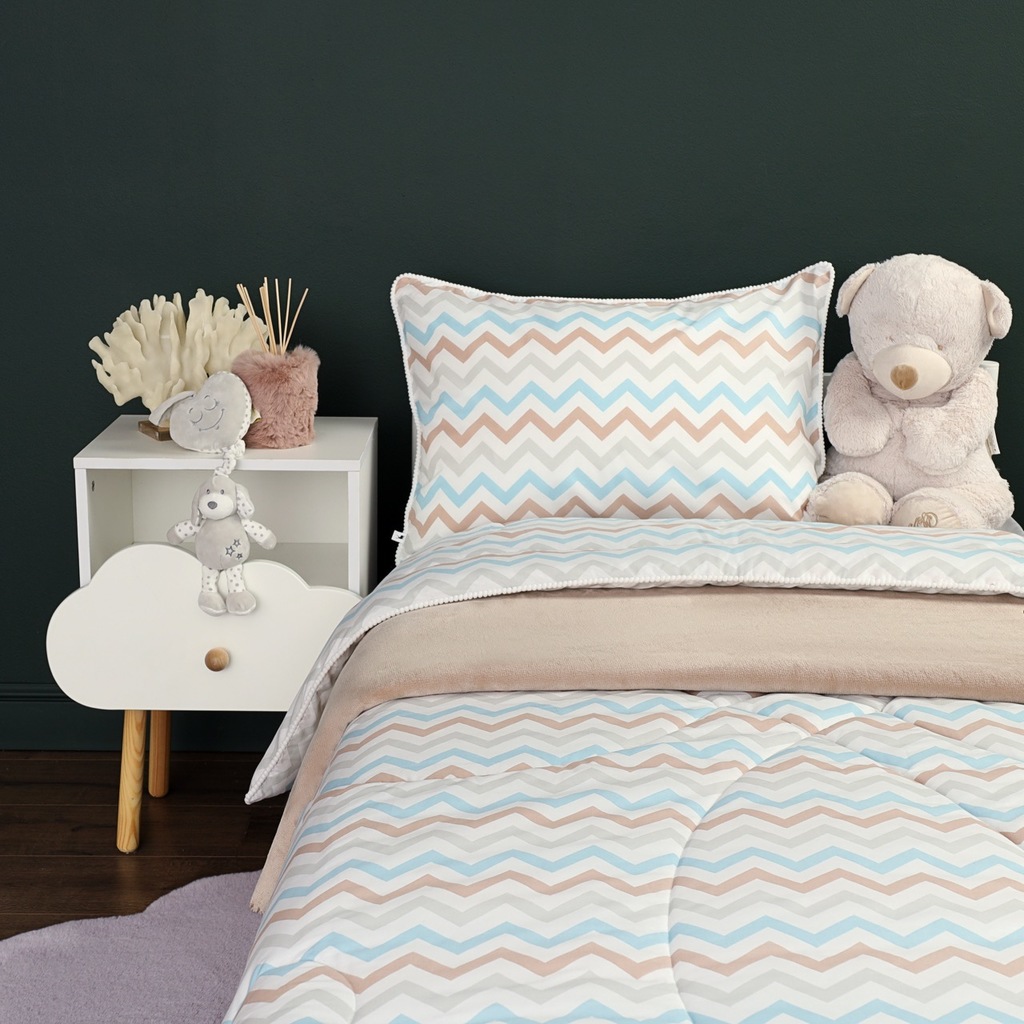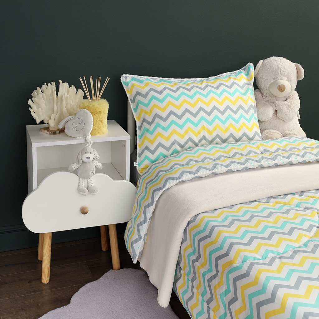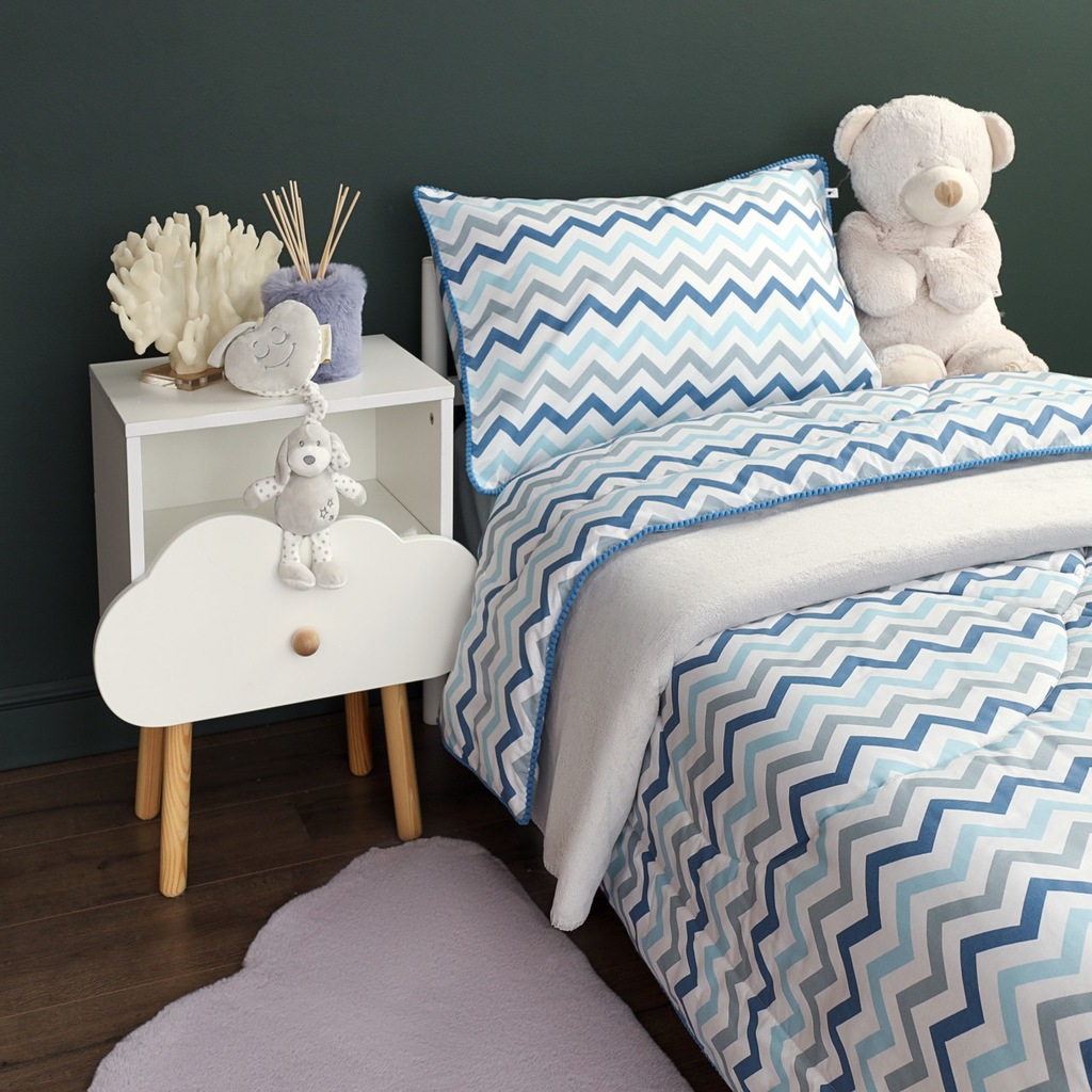 Комплект с одеялом : Одеяло 160х220 см (1) Простыня на резинке 90х190 см (1) Наволочка 50х70 см (1), наволочка на молнии. Состав: 100% хлопок, трикотаж Уход : деликатная стирка Упаковка: ПВХ упаковка