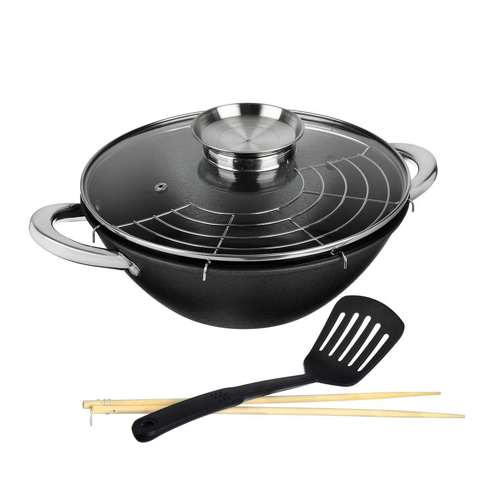 SATOSHI Казан чугун,30см,4,4л,антипр.покр,решетка,стекл.крыш,нейлон.лопатка,бамб.палочки,индукцияВопросы по товару