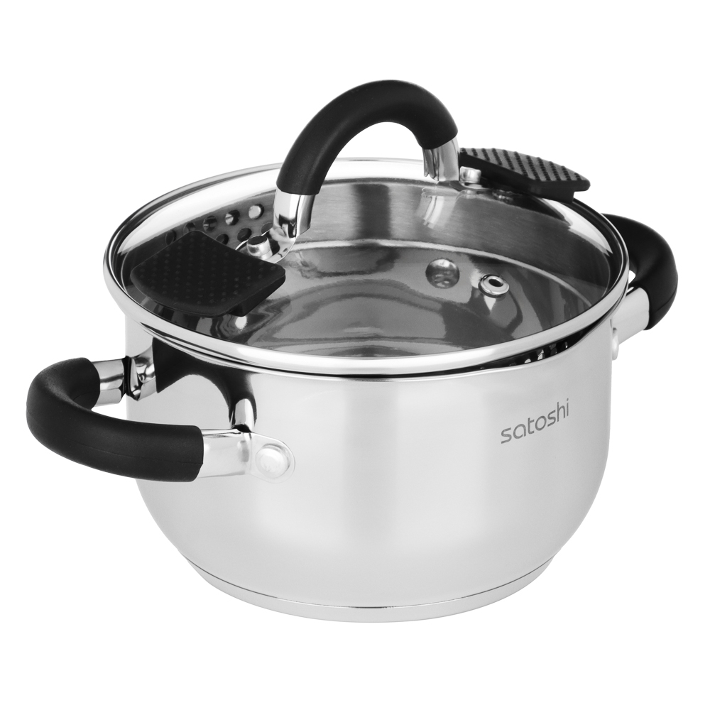 Кастрюля SATOSHI «Арбон» 16х9,5 см, объем 1,8 л, со стеклянной крышкой с паровыпуском – это прекрасная помощница для приготовления первых блюд, варки гарниров и компотов. Изготовлена из высококачестве... Показать описаниенной нержавеющей стали, имеет толстые стенки, устойчивые к деформации. Пятислойное капсульное дно обеспечивает равномерное распределение тепла, быстро нагревается и долго сохраняет температуру. Предусмотрена мерная шкала для замера точных объемов. Силиконовые протекторы ручек защищают руки от ожогов. Держатели на крышке для удобства слива жидкости и специальные отверстия для слива делают процесс использования максимально комфортным и эффективным, позволяя сливать лишнюю жидкость без попадания продуктов в раковину. Рекомендации Перед использованием помыть неабразивным моющим средством для посуды.
