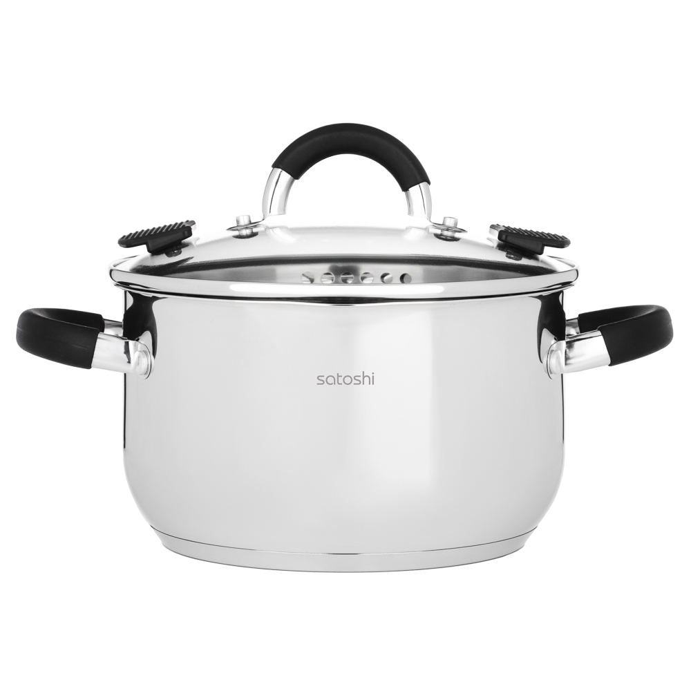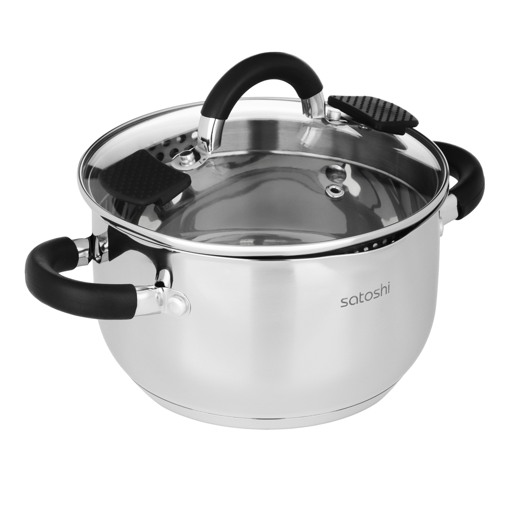 Кастрюля SATOSHI «Арбон» размером 20х11,5 см и объемом 3,4 л, со стеклянной крышкой с паровыпуском – это прекрасная помощница для приготовления первых блюд, варки гарниров и компотов. Изготовлена из в... Показать описаниеысококачественной нержавеющей стали, имеет толстые стенки, устойчивые к деформации. Пятислойное капсульное дно обеспечивает равномерное распределение тепла, быстро нагревается и долго сохраняет температуру. Предусмотрена мерная шкала для замера точных объемов. Силиконовые протекторы ручек защищают руки от ожогов. Держатели на крышке для удобства слива жидкости и специальные отверстия для слива делают процесс использования максимально комфортным и эффективным, позволяя сливать лишнюю жидкость без попадания продуктов в раковину. Рекомендации Перед использованием помыть неабразивным моющим средством для посуды.