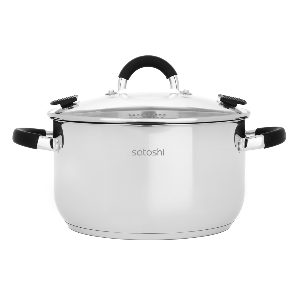 Кастрюля SATOSHI «Арбон» размером 24х13,5 см и объемом 5,9 л, со стеклянной крышкой с паровыпуском – это прекрасная помощница для приготовления первых блюд, варки гарниров и компотов. Изготовлена из в... Показать описаниеысококачественной нержавеющей стали, имеет толстые стенки, устойчивые к деформации. Пятислойное капсульное дно обеспечивает равномерное распределение тепла, быстро нагревается и долго сохраняет температуру. Предусмотрена мерная шкала для замера точных объемов. Силиконовые протекторы ручек защищают руки от ожогов. Держатели на крышке для удобства слива жидкости и специальные отверстия для слива делают процесс использования максимально комфортным и эффективным, позволяя сливать лишнюю жидкость без попадания продуктов в раковину. Рекомендации Перед использованием помыть неабразивным моющим средством для посуды.