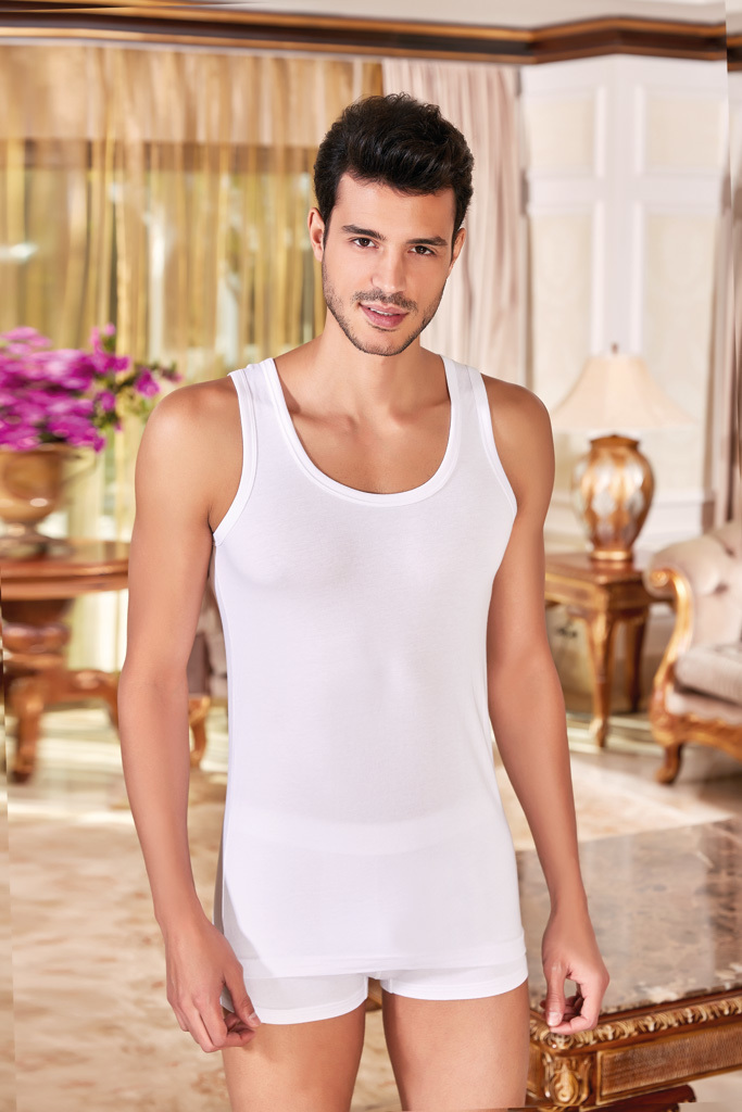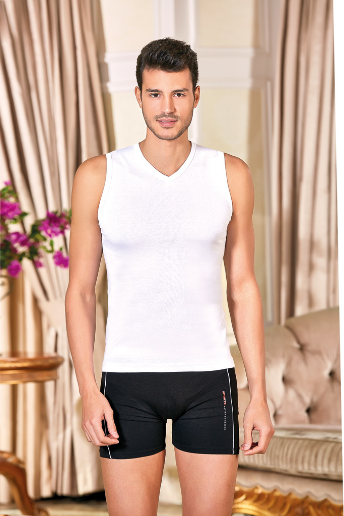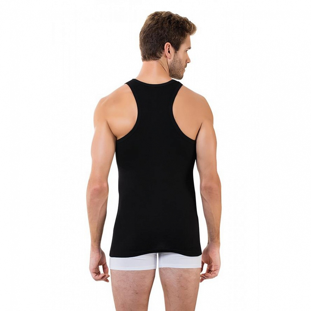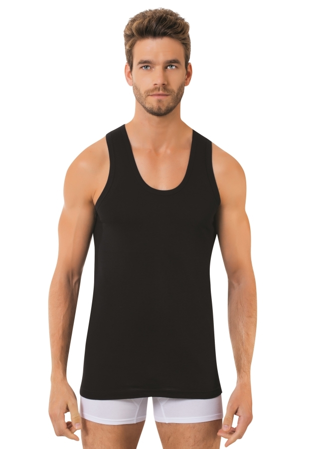 Мужская майка Berrak на широких лямках. Слегка приталенная. Спина борцовка. Изделие изготовлено из 100% хлопка рибана. Мужская классическая майка на широких лямках, без боковых швов представляет собой... Показать описание простую и элегантную одежду, которая может использоваться как нижнее белье или как верхний слой в зависимости от стиля и предпочтений владельца.. Майки без боковых швов часто предпочитаются теми, кто ценит минимализм и удобство в одежде