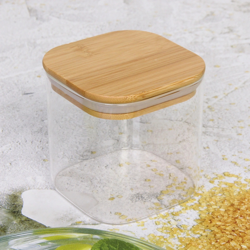 Банка для продуктов стеклянная 400мл "Хай-Тек" с бамбуковой крышкой, квадратная 6*15смВопросы по товару