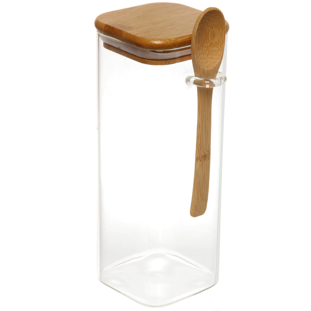 Банка для продуктов стеклянная 850мл "Хай-Тек" с бамбуковой крышкой и ложкой, квадратная 8*20смВопросы по товару