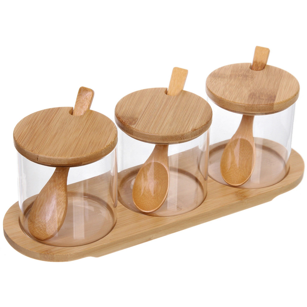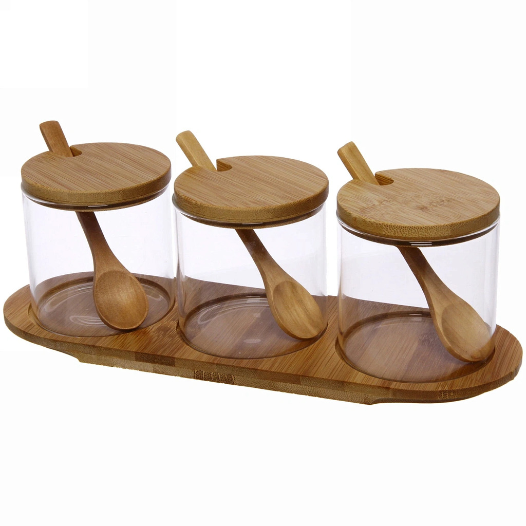 Банка стеклянная для специй 300мл "Хай-Тек" в наборе 3шт на бамбуковой подставкеВопросы по товару
