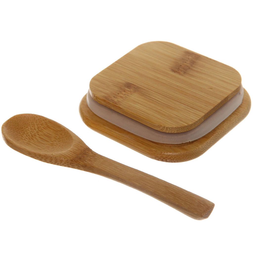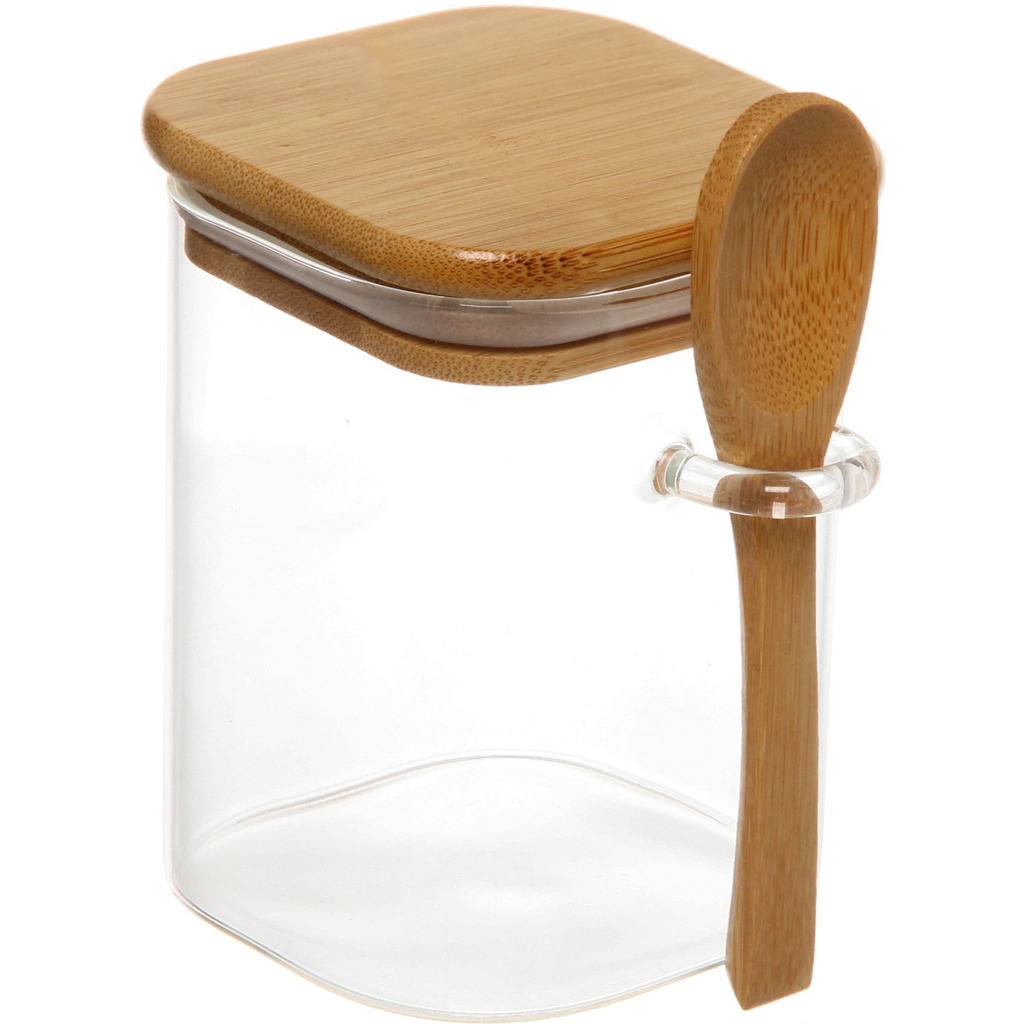Банка для продуктов стеклянная 700мл "Хай-Тек" с бамбуковой крышкой и ложкой, квадратная 8*15смВопросы по товару