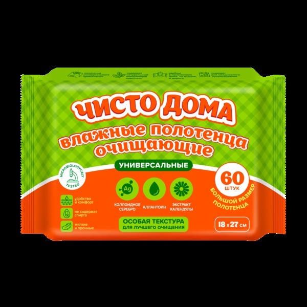 Бренд: ЧИСТО ДОМА Серия: - Материал: Нетканый материал ШтрихКод: 4610080728433 Страна происхождения: Россия Полотенца влажные Чисто дома очищающие универсальные с календулой 60 шт