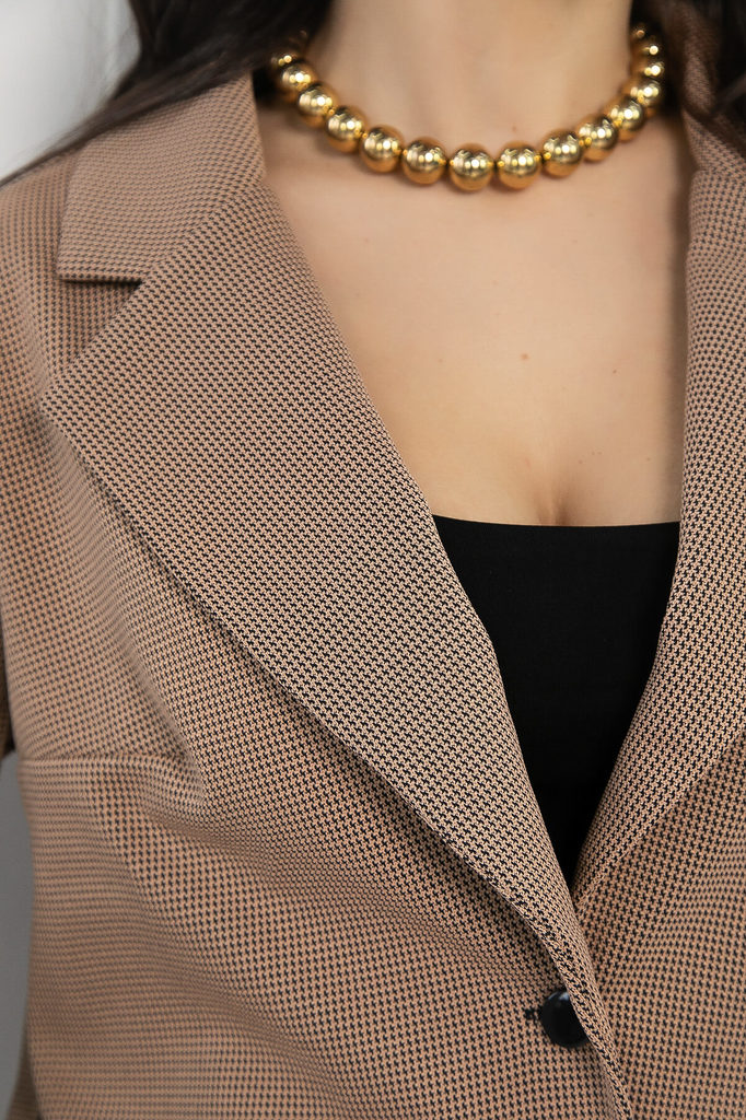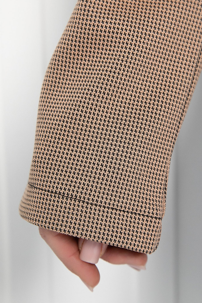 Артикул: Б12780-13М. Тип ткани: смесовая. Состав: 60% полиэстер, 35% вискоза, 5% эластан. Материал: трикотаж. Цвет: песочный. Принт: гусиная лапка. Вид застежки: пуговицы. Силуэт: свобо... Показать описаниедный. Карманы: есть. Подкладка: отсутствует. Декоративные элементы: отсутствуют. Длина по спинке от верхней точки плеча: 44-52/ 55 см. Размер изделия на модели: 44 Рост модели: 167 см. Женский жакет прямого силуэта идеально подходит для создания как повседневных, так и более элегантных образов. Спинка — со средним швом. Горловина обработана отложным воротником английского типа с отрезной стойкой. Застёжка на две обмётанные петли и пуговицы. Рукава — втачные длинные. Уход за изделием: ручная стирка до 30 градусов; нельзя отбеливать; отжим запрещён; гладить при t не более 110 С; гладить с изнанки. Внимание! Рекомендуем ориентироваться на размерную сетку и выбирать свой привычный размер, согласно размерной таблице. *Допуск отклонения длины при массовом производстве 1-3 см является нормой.