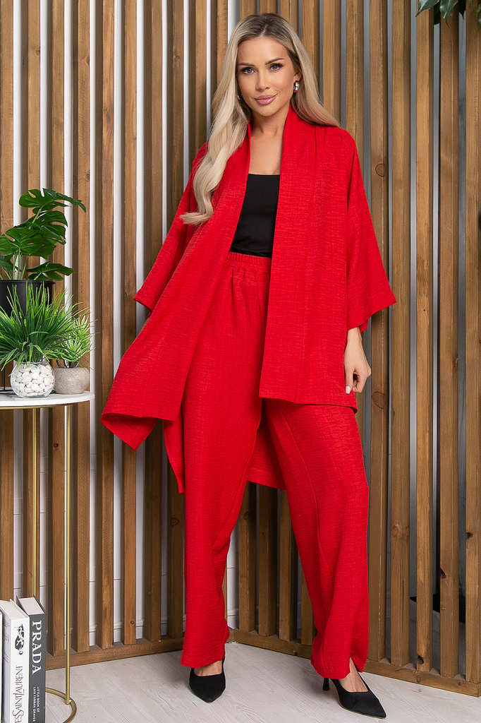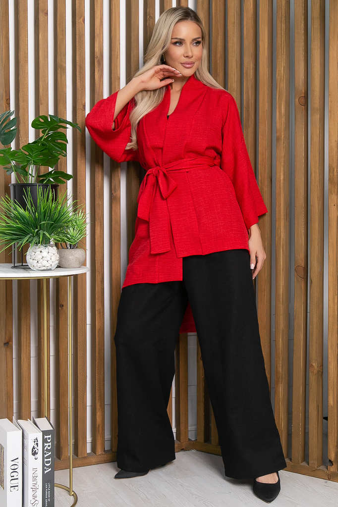 Состав: 65% полиэстер, 30% вискоза, 5% эластан. Материал: плательно-костюмный. Цвет: красный. Принт: отсутствует. Силуэт: асимметричный. Карманы: отсутствуют. Подкладка: отсутствует. Ви... Показать описаниед застежки: без застёжки. Декоративные элементы: отсутствуют. Длина: М (46-48) - 96 см, L (50-52) - 96 см, XL (54-56) - 96 см. Жакет отснят с брюками арт.Б13217-16М Жакет-кимоно из легкой ткани под «лён» — идеальный элемент для создания стильных образов! Этот жакет обладает спущенным рукавом и асимметричным кроем, где одна сторона переда длиннее другой на 10 см, что добавляет оригинальности и динамики вашему наряду. Асимметричные разрезы по бокам обеспечивают свободу движений и делают жакет еще более интересным. Широкий пояс из основной ткани, который входит в комплект, позволяет подчеркивать талию. Можно носить самостоятельно или как второй слой поверх майки или топа. Привнесите в свой гардероб нотку элегантности и легкости! Уход за изделием: ручная стирка до 30 градусов; нельзя отбеливать; отжим запрещён; гладить при t не более 110 С; гладить с изнанки. Внимание! Рекомендуем ориентироваться на размерную сетку и выбирать свой привычный размер, согласно размерной таблице. *Допуск отклонения длины при массовом производстве 1-3 см является нормой.