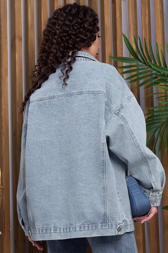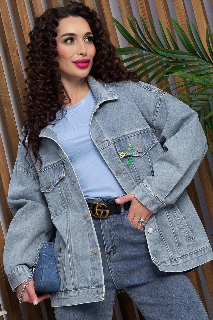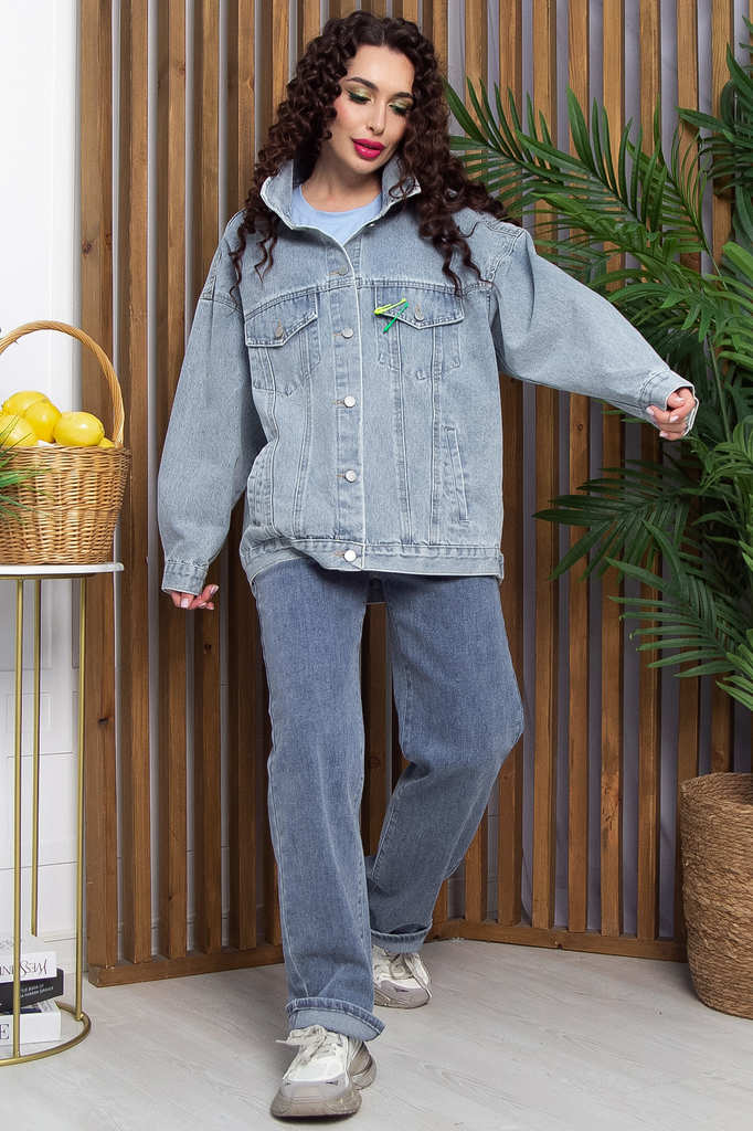 Состав: 100% хлопок. Материал: джинса. Цвет: серо-голубой. Принт: отсутствует. Силуэт: свободный. Карманы: есть. Подкладка: отсутствует. Вид застежки: пуговицы металлические. Декоративные эл... Показать описаниеементы: декоративные булавки. Длина: ONE SIZE (44-52) - 71 см. Жакет отснят с топом арт.Б13055-33М Джинсовый жакет в серо-голубом оттенке станет вашей любимой базовой вещью в гардеробе! Классический стиль жакета включает отрезную кокетку по спинке и переду, а также карманы-обманки на переднем полотнище и действующие карманы ниже. Декоративные булавки добавляют изюминку. Спущенное плечо и длинные рукава на манжете с пуговицей обеспечивают комфорт. Воротник рубашечного типа плавно переходит в планку на пуговицах. Этот жакет искусственно потерт и состарен, что придает ему особый шарм. Уход за изделием: ручная стирка до 30 градусов; нельзя отбеливать; отжим запрещён; гладить при t не более 110 С; гладить с изнанки. Внимание! Рекомендуем ориентироваться на размерную сетку и выбирать свой привычный размер, согласно размерной таблице. *Допуск отклонения длины при массовом производстве 1-3 см является нормой.