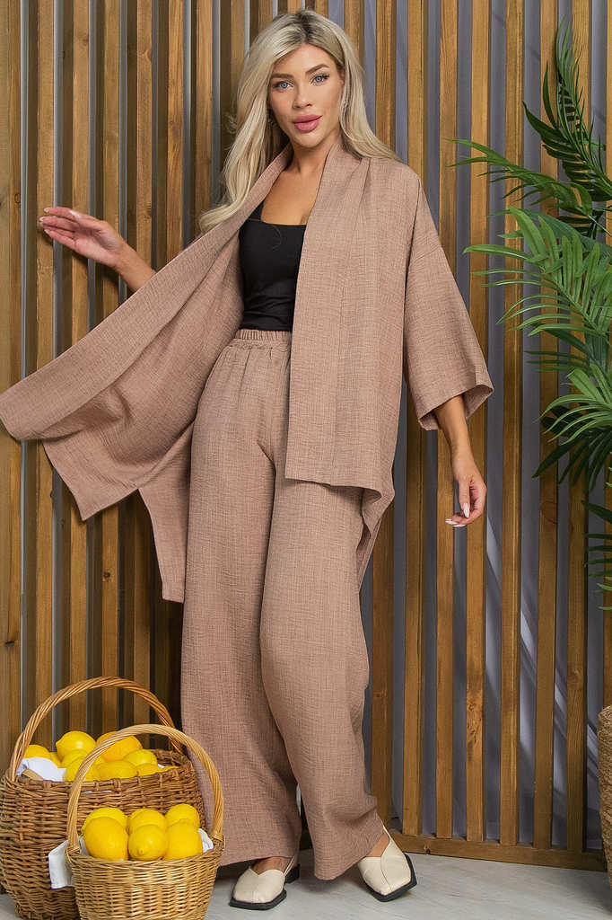 Состав: 65% полиэстер, 30% вискоза, 5% эластан. Материал: плательно-костюмный. Цвет: бежевый. Принт: отсутствует. Силуэт: асимметричный. Карманы: отсутствуют. Подкладка: отсутствует. Ви... Показать описаниед застежки: без застёжки. Декоративные элементы: отсутствуют. Длина: М (46-48) - 96 см, L (50-52) - 96 см, XL (54-56) - 96 см. Жакет отснят с брюками арт.Б13199-16М Жакет-кимоно из легкой ткани под «лён» — идеальный элемент для создания стильных образов! Этот жакет обладает спущенным рукавом и асимметричным кроем, где одна сторона переда длиннее другой на 10 см, что добавляет оригинальности и динамики вашему наряду. Асимметричные разрезы по бокам обеспечивают свободу движений и делают жакет еще более интересным. Широкий пояс из основной ткани, который входит в комплект, позволяет подчеркивать талию. Можно носить самостоятельно или как второй слой поверх майки или топа. Привнесите в свой гардероб нотку элегантности и легкости! Уход за изделием: ручная стирка до 30 градусов; нельзя отбеливать; отжим запрещён; гладить при t не более 110 С; гладить с изнанки. Внимание! Рекомендуем ориентироваться на размерную сетку и выбирать свой привычный размер, согласно размерной таблице. *Допуск отклонения длины при массовом производстве 1-3 см является нормой.