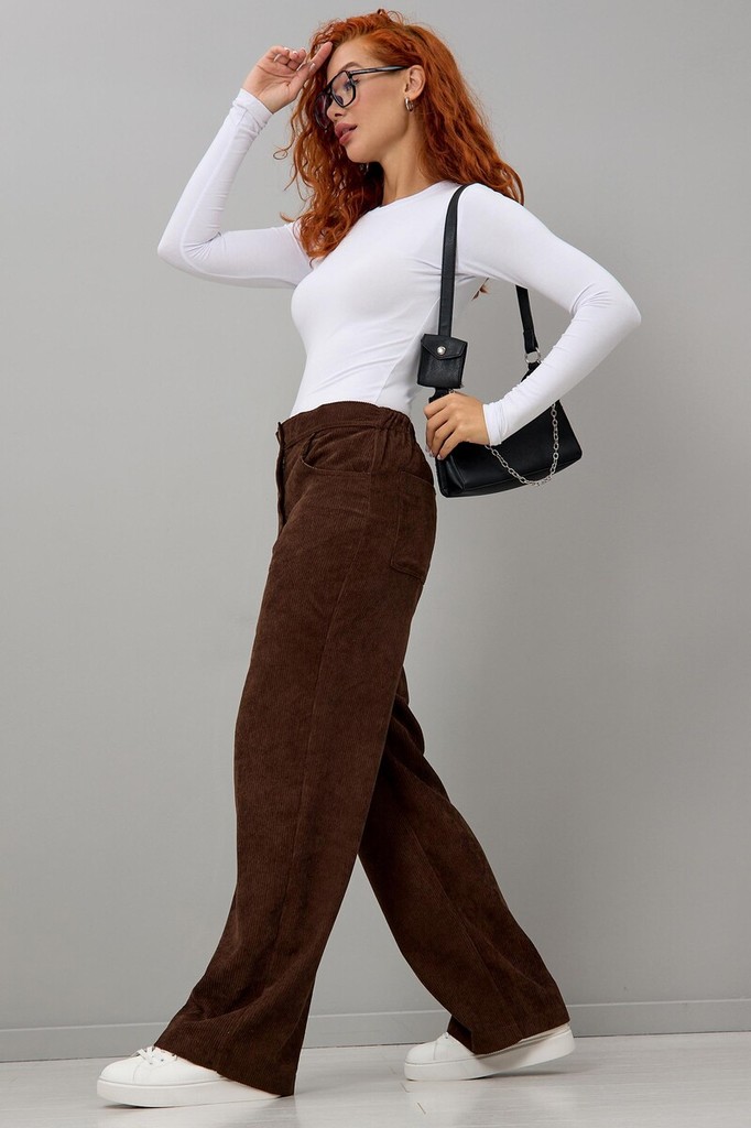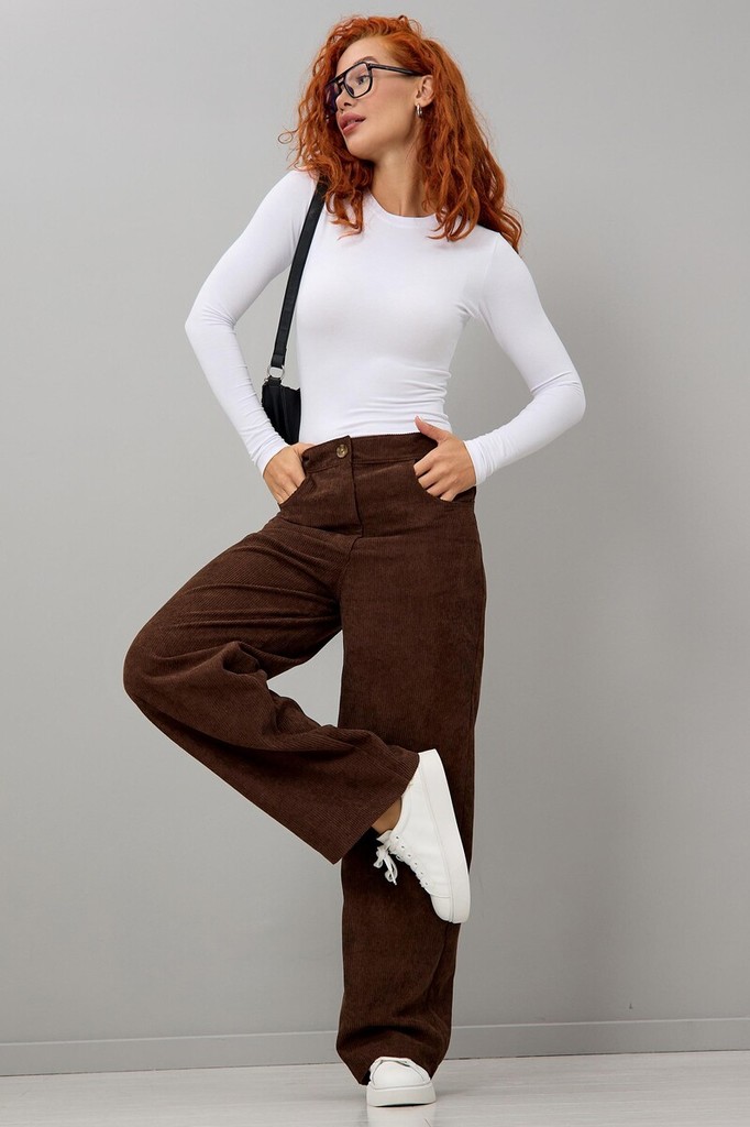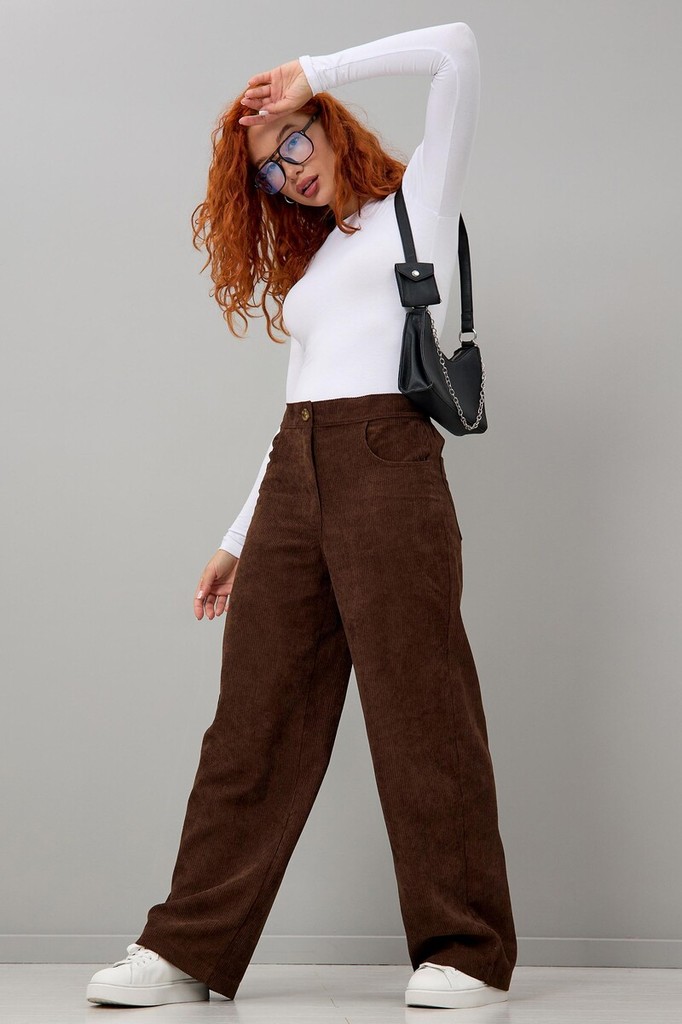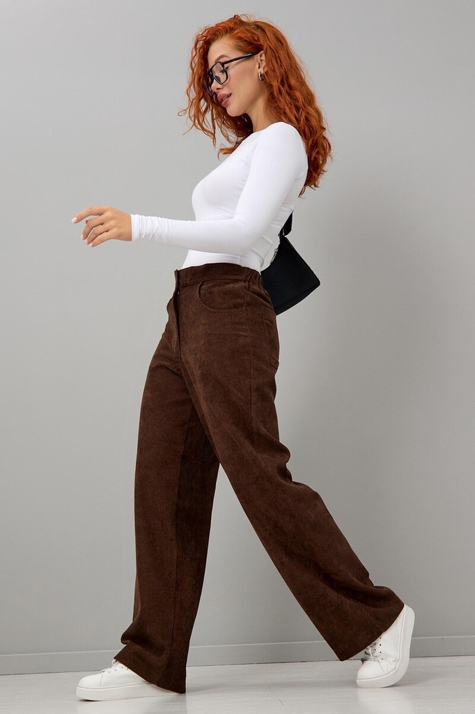 Широкие брюки неяркого коричневого оттенка длиной в пол – идеальный вариант для весеннего гардероба. Высокая посадка визуально удлиняет силуэт. Для изготовления модели с фигурной кокеткой на спинке и ... Показать описаниезакругленными боковыми карманами, как у джинсов, использовали мягкий микровельвет на основе вискозы. Застежка – гульфик, шлевки для кожаного ремня. На фото представлены с жилетом В-91 ВЛК(В4) и джемпером С-41 СКР(В4).